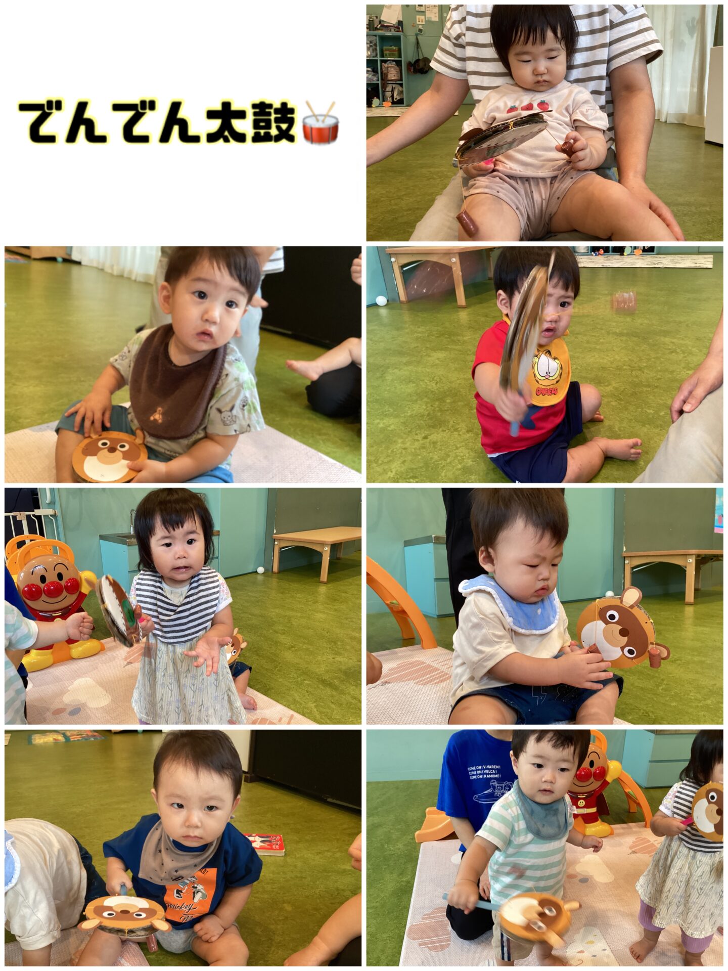 でんでん太鼓は、たぬきの目のシールを先生と一緒に貼り、『証城寺の狸囃子』の歌に合わせてみんなでポンポンと音を奏でました♫