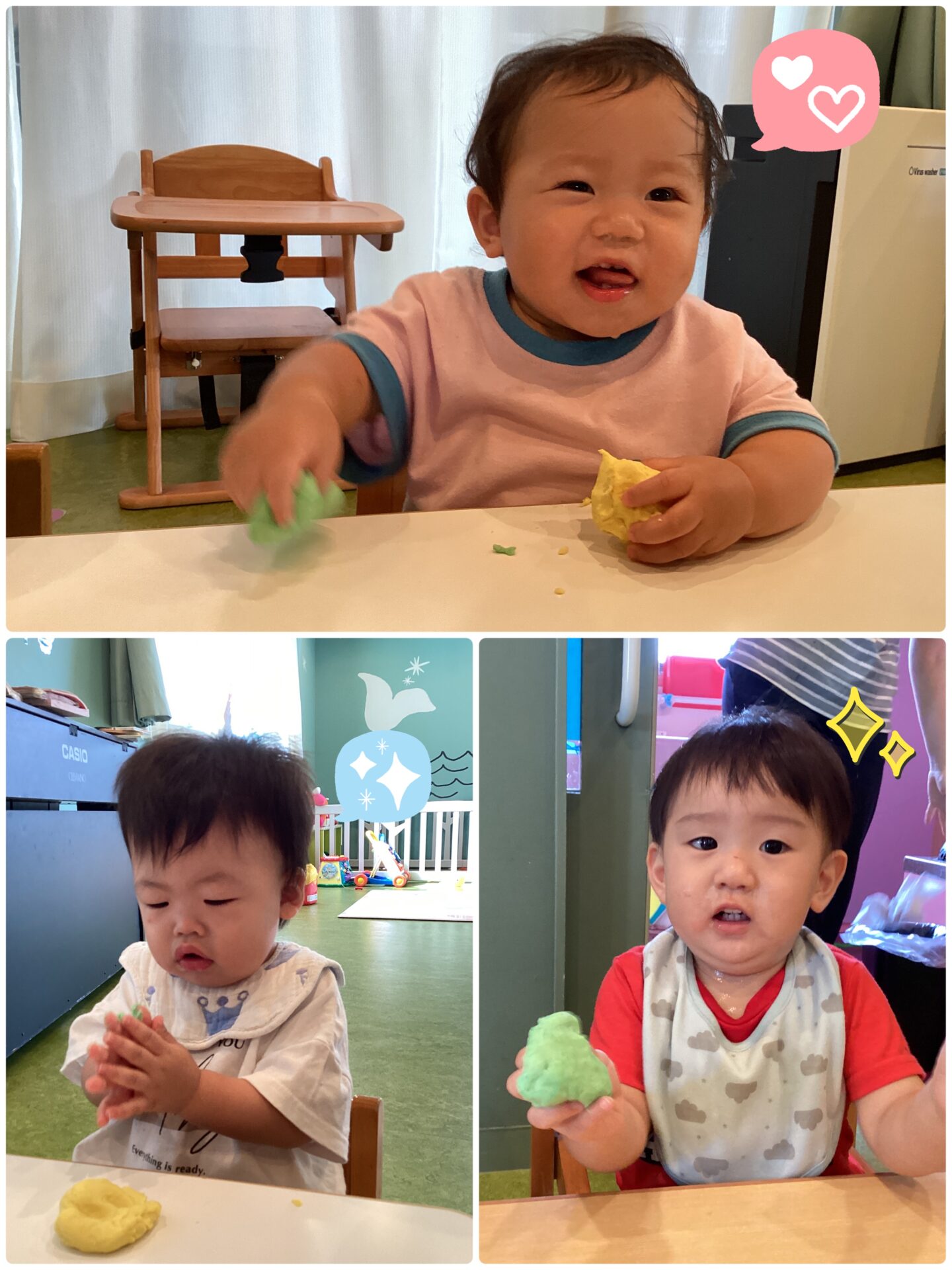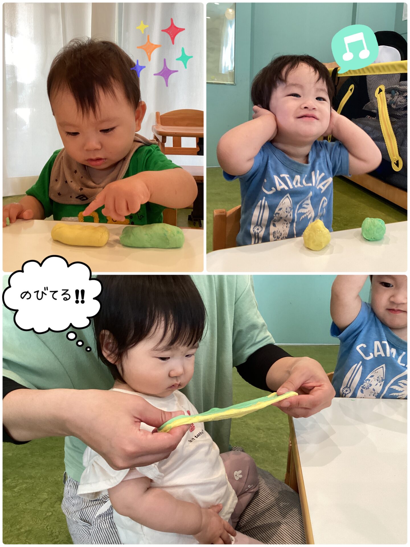 うみチームにとって何度か遊んだことのある小麦粉粘土ですが、今回は緑色と黄色の色付き粘土です✨