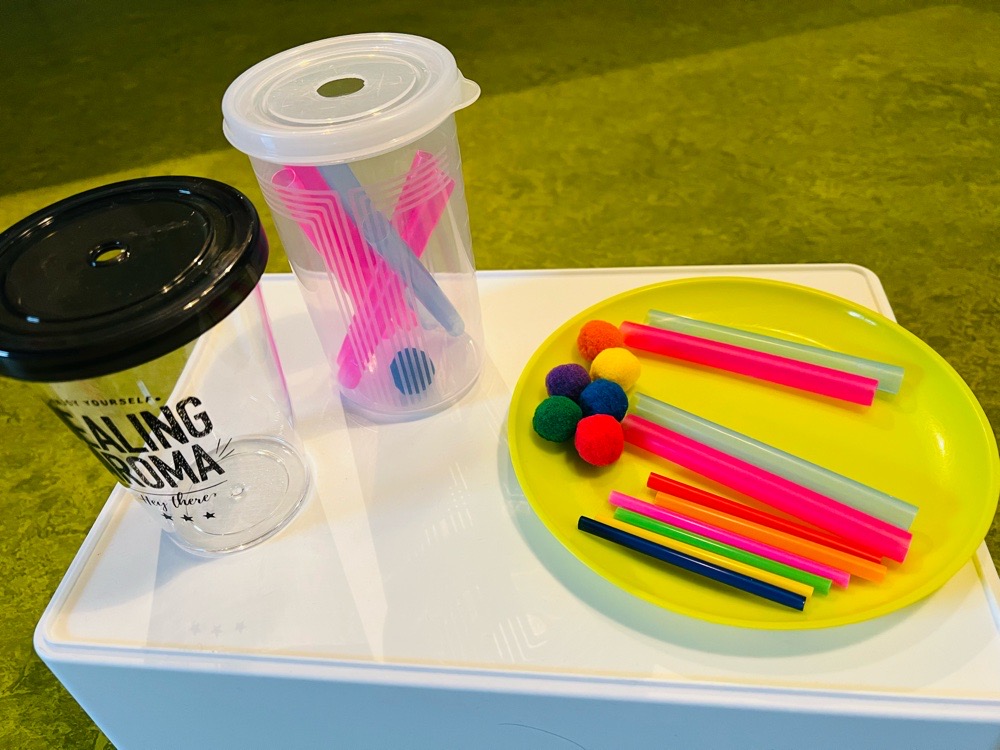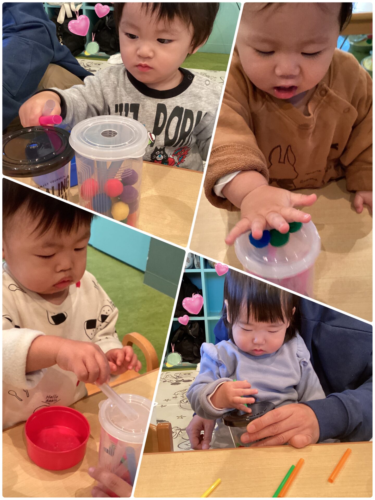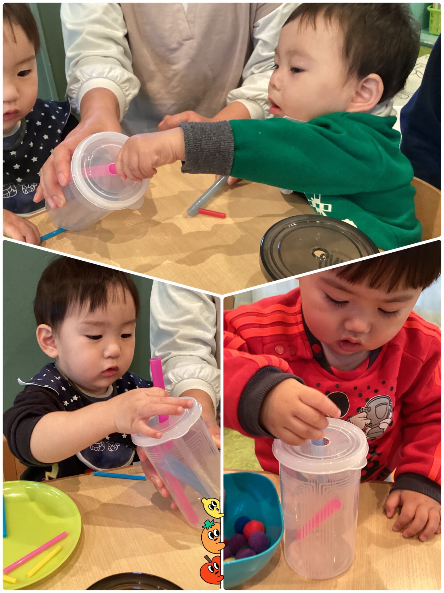 穴の中にストローを入れたり、ポンポンを入れたり、