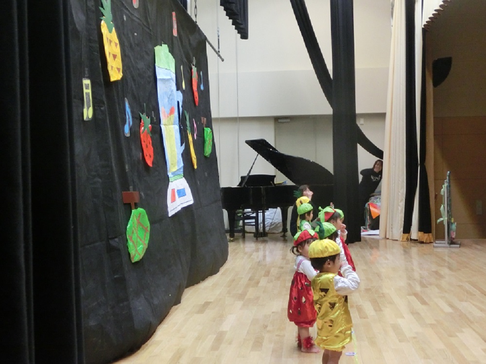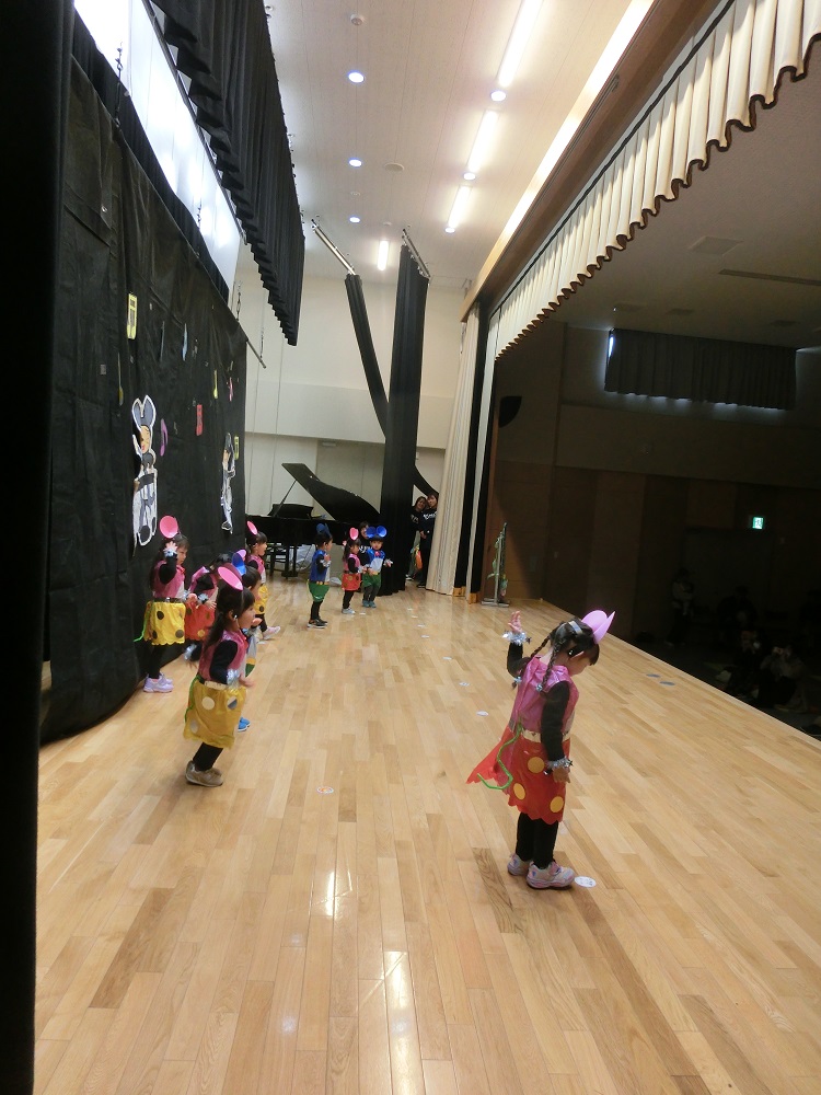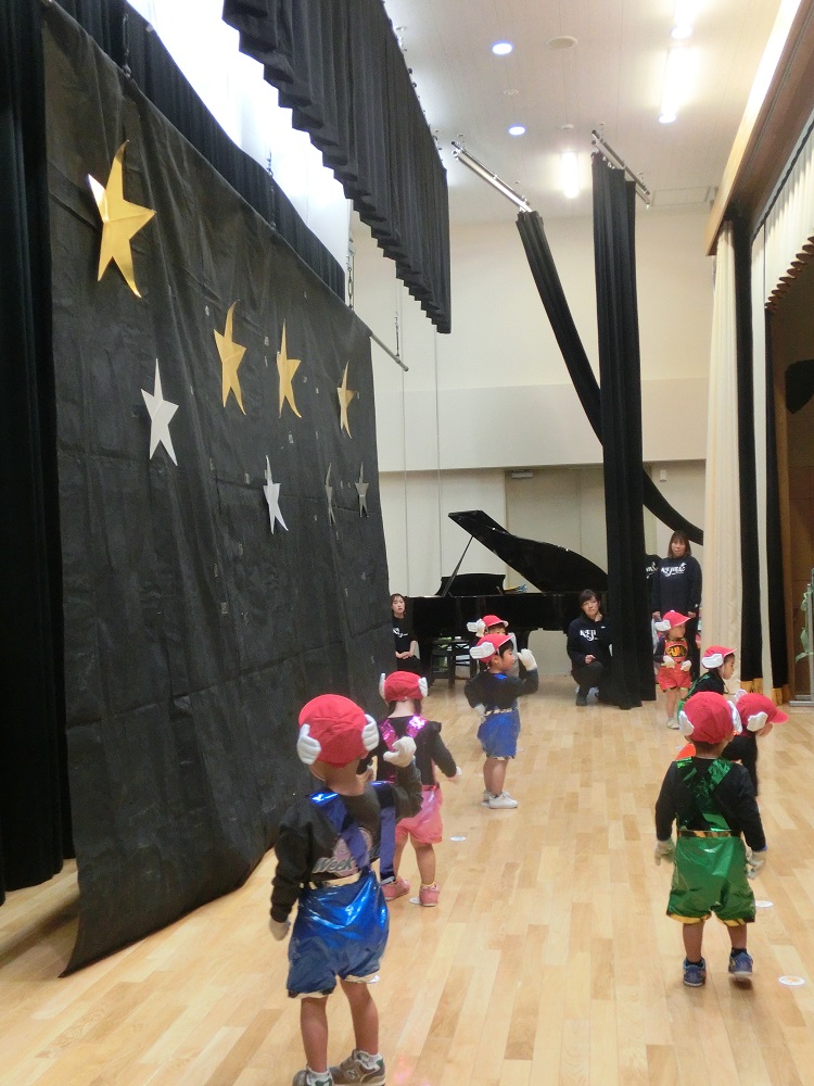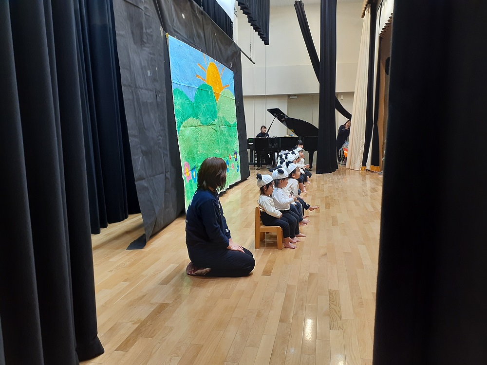 最近寒さのせいか、体調不良の園児が多かったので今日はお休みがちらほらいるかな~と思っていましたがなんと欠席者なしの全員揃ってステージに立つことが出来ました✨