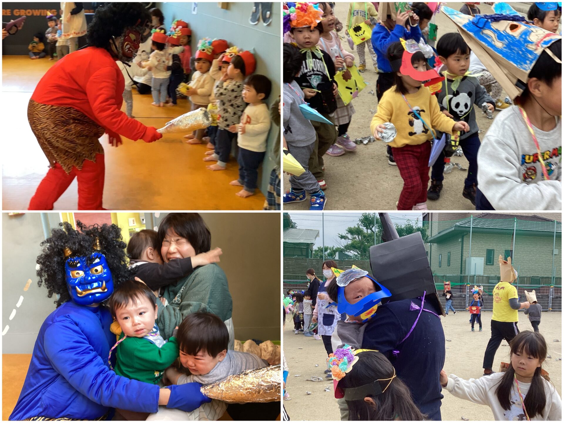 豆に見立てた新聞紙ボールを投げたり、鬼から逃げたり、頑張って戦っていた子どもたち!