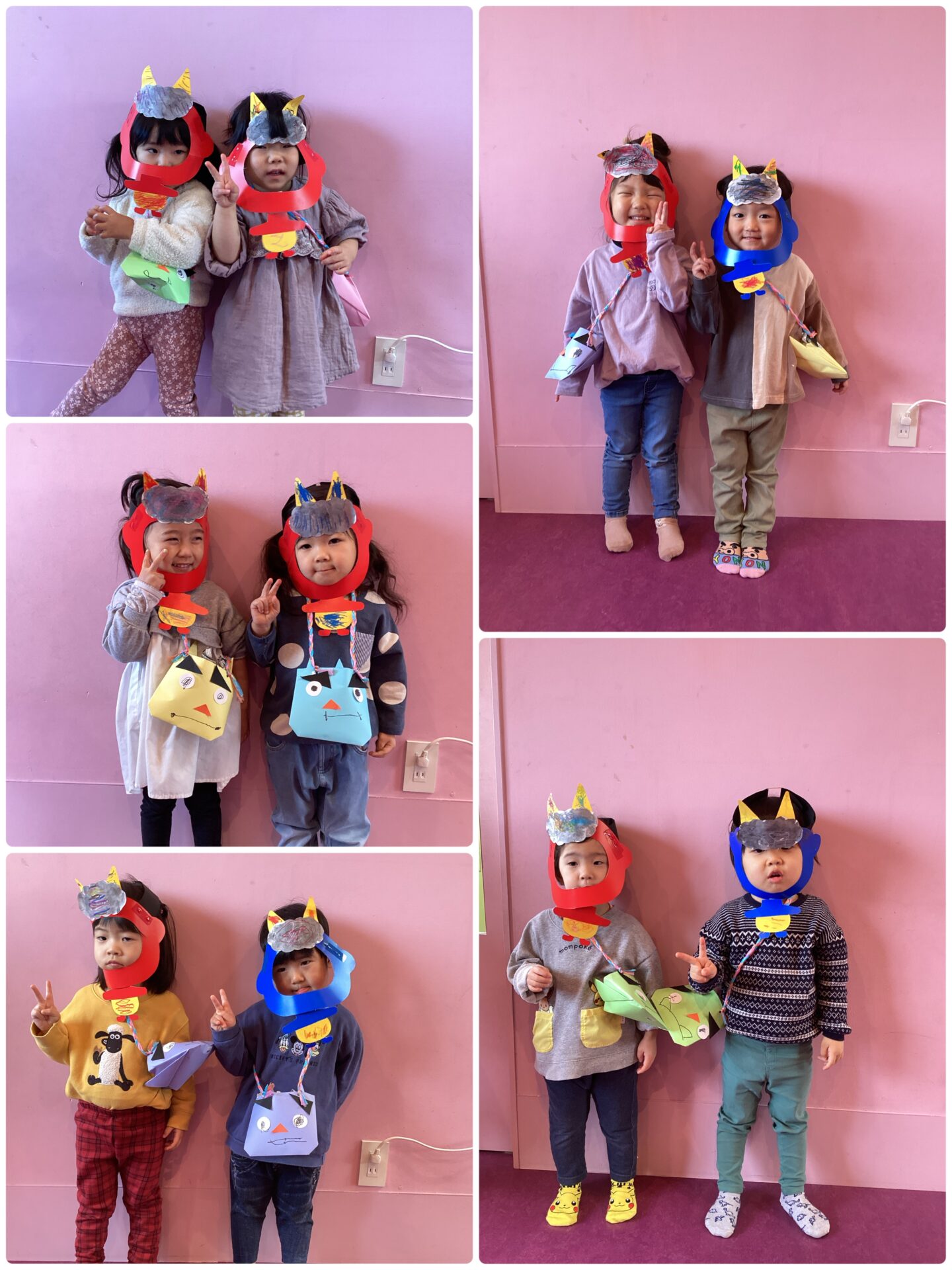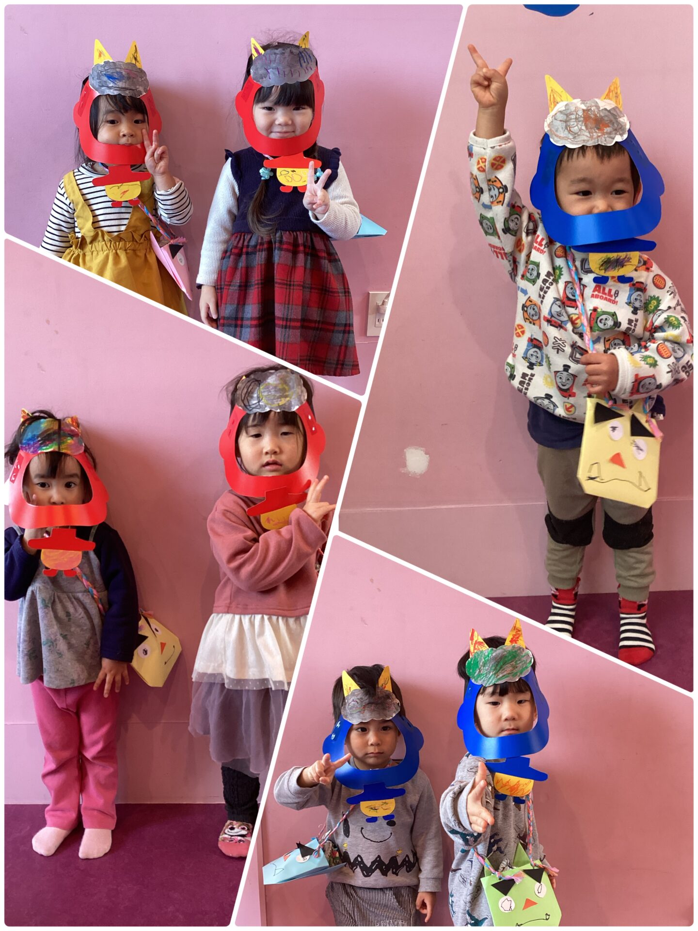 当日はお面と豆入れを身につけ「鬼はー外!福はー内!ってやっつける!!」と意気込んでいましたが…😤