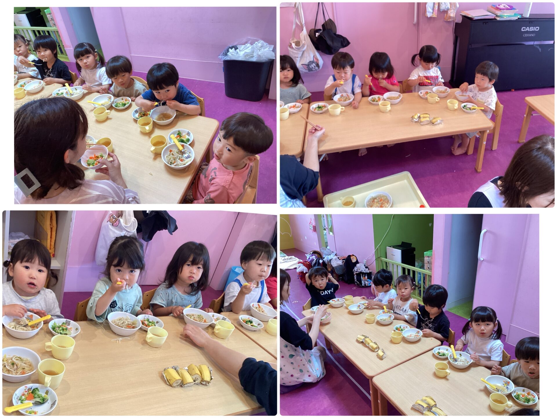 進級、入園して1ヶ月が経ちました。毎日たくさん遊んだ後に食べる給食は格別に美味しいようで自分で食べようとする姿も見られます😀美味しく食べてる様子をご覧ください😆