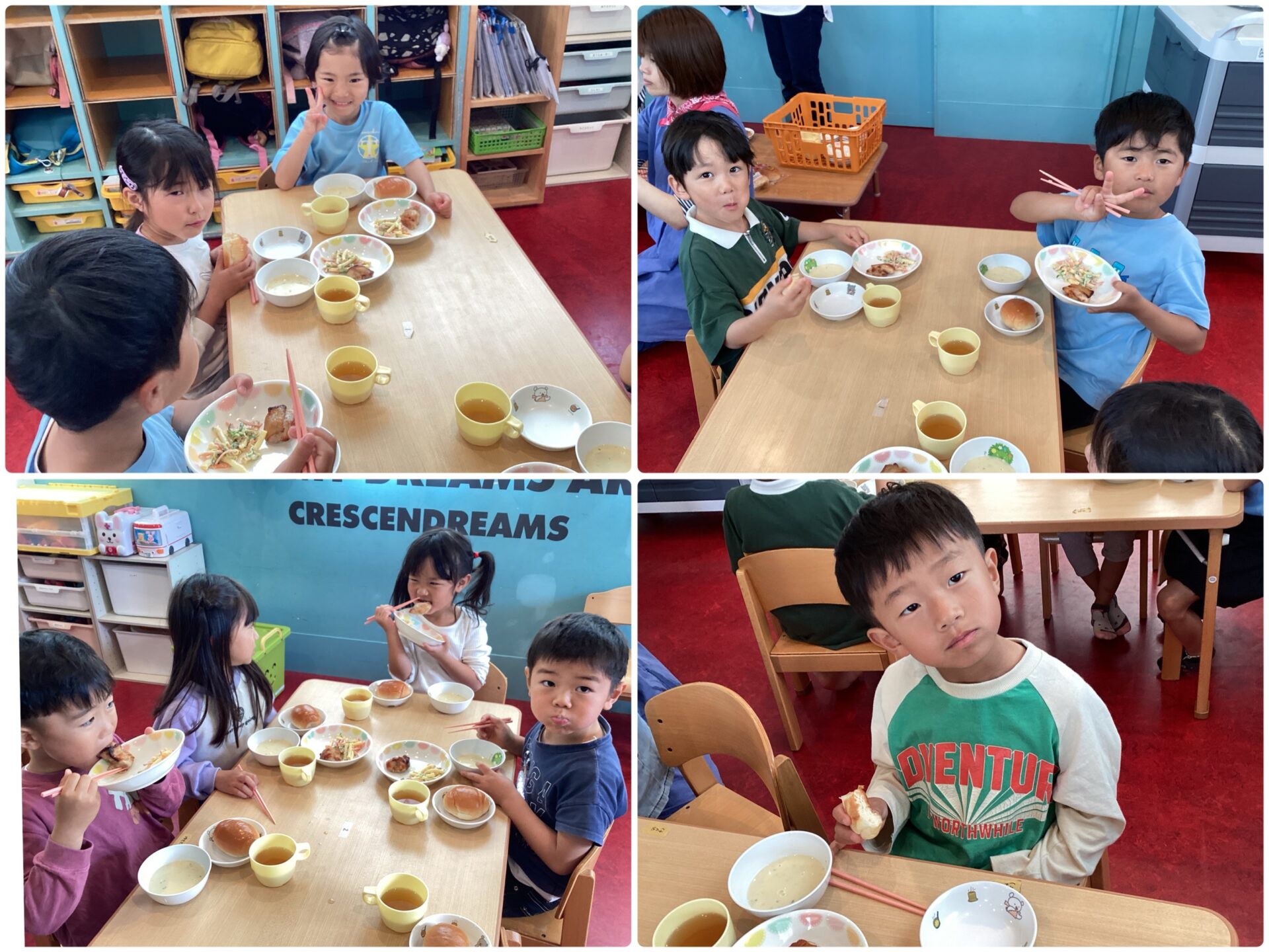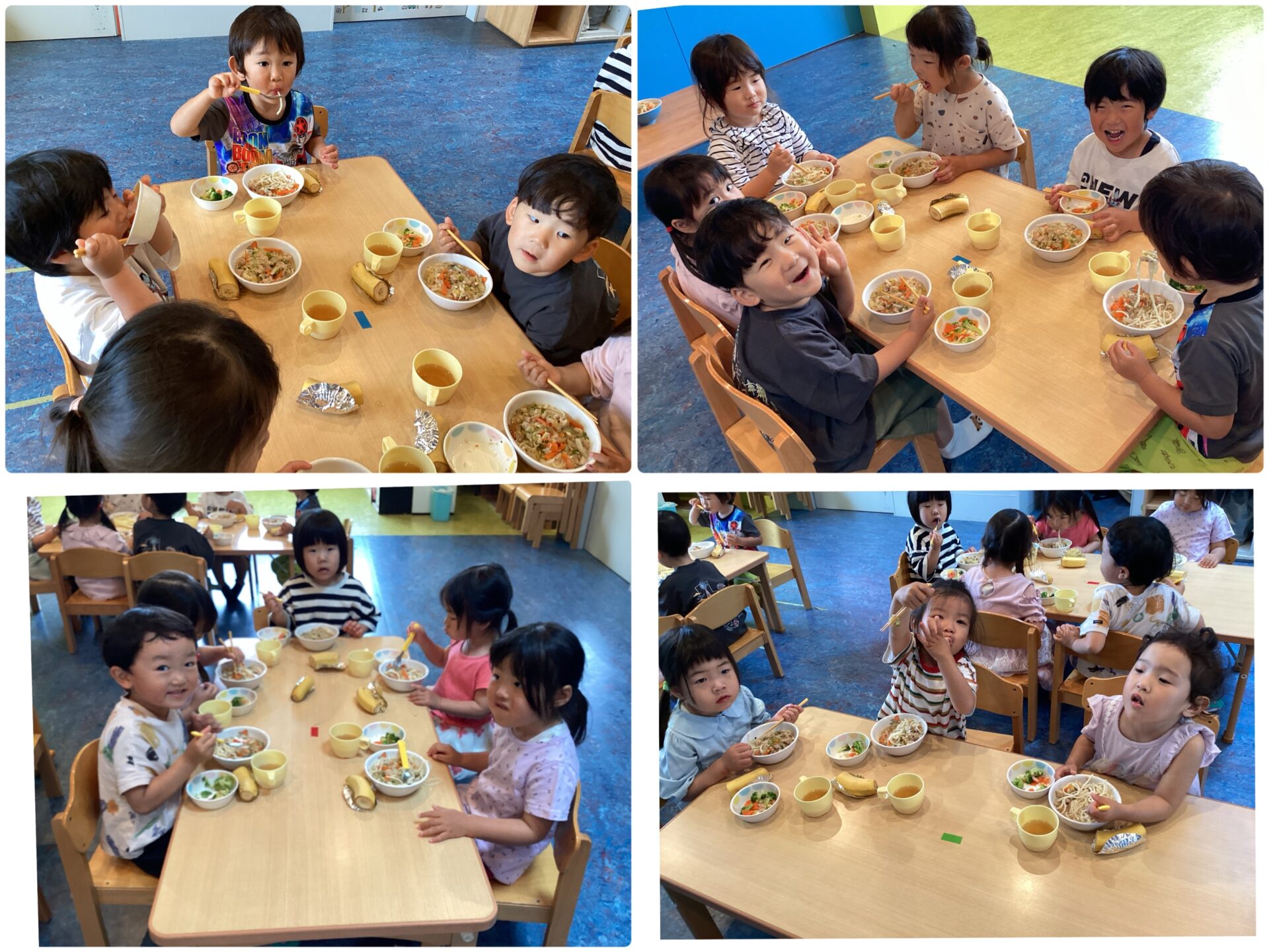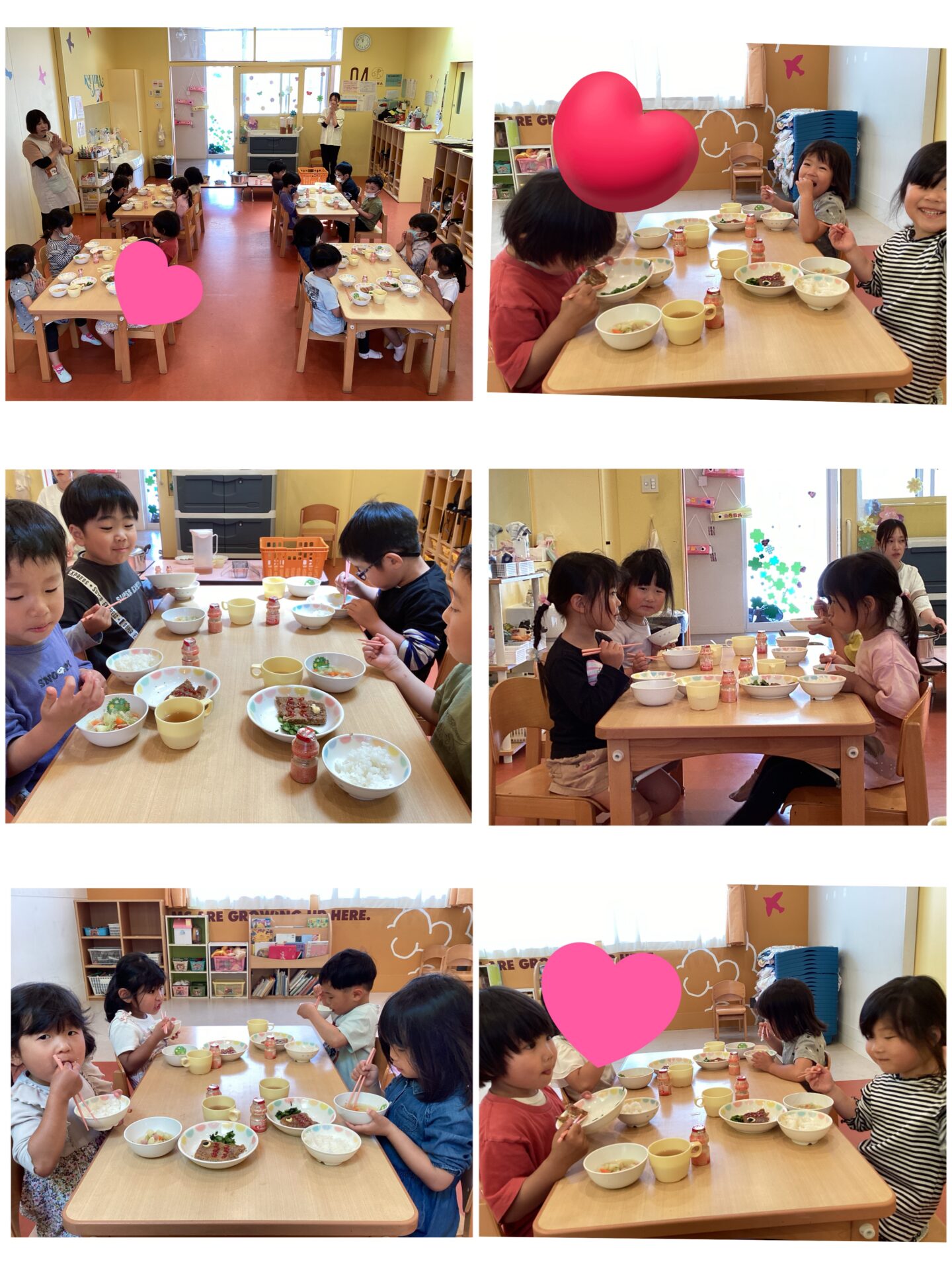 そらチーム🍙自分達で配膳を行い、お皿の置き方や箸の持ち方など保育者と確認しながら食事マナーも学んでます✨鯉のぼりメニューで子どもたちも嬉しそうに食べてます🎏
