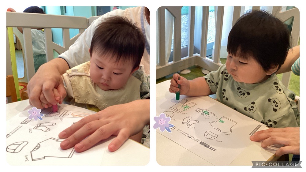 製作ではお絵描きに挑戦し、洋服や靴など名前を教えながら色塗りをしました。