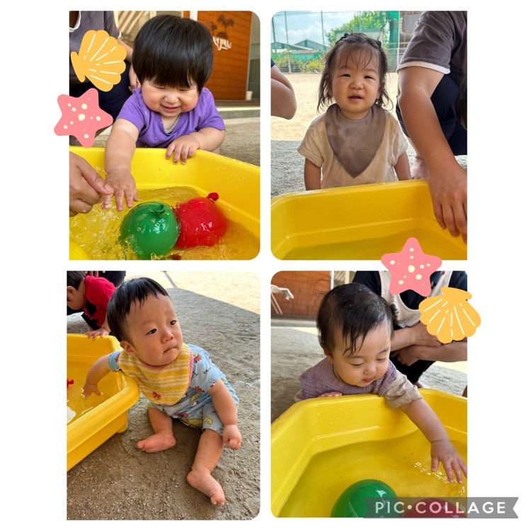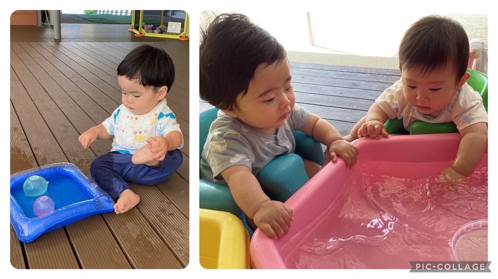 冷たくて気持ちいい水遊びが始まり、興味津々で手を伸ばして触っています🎵