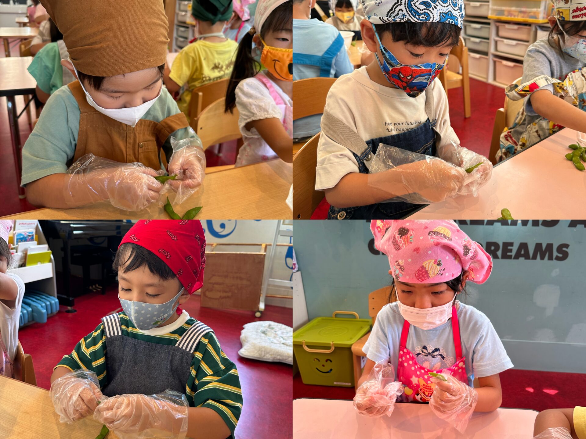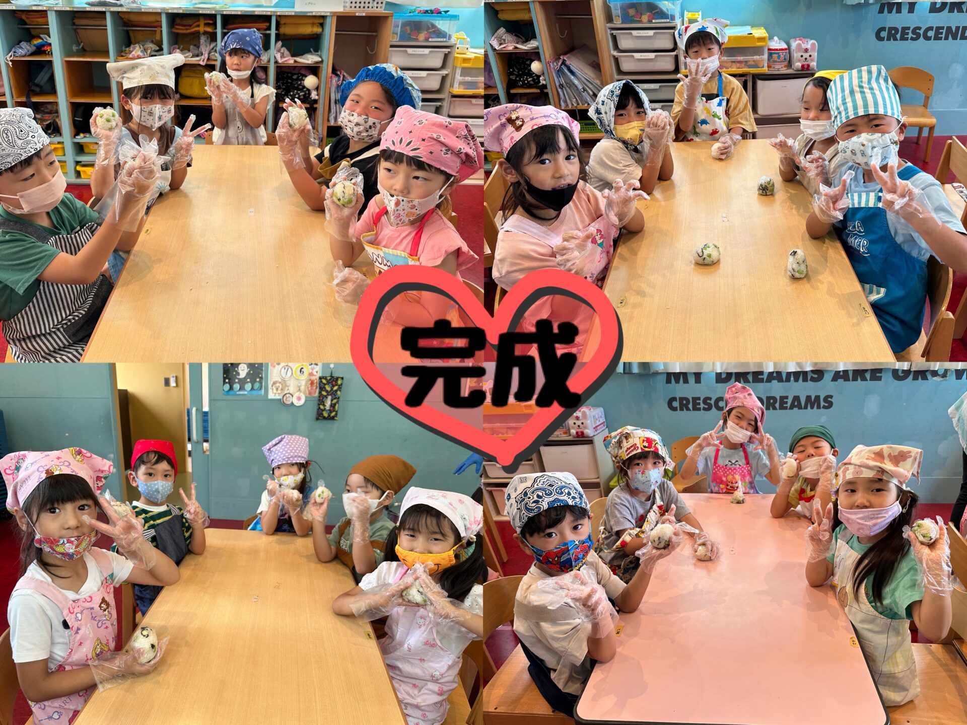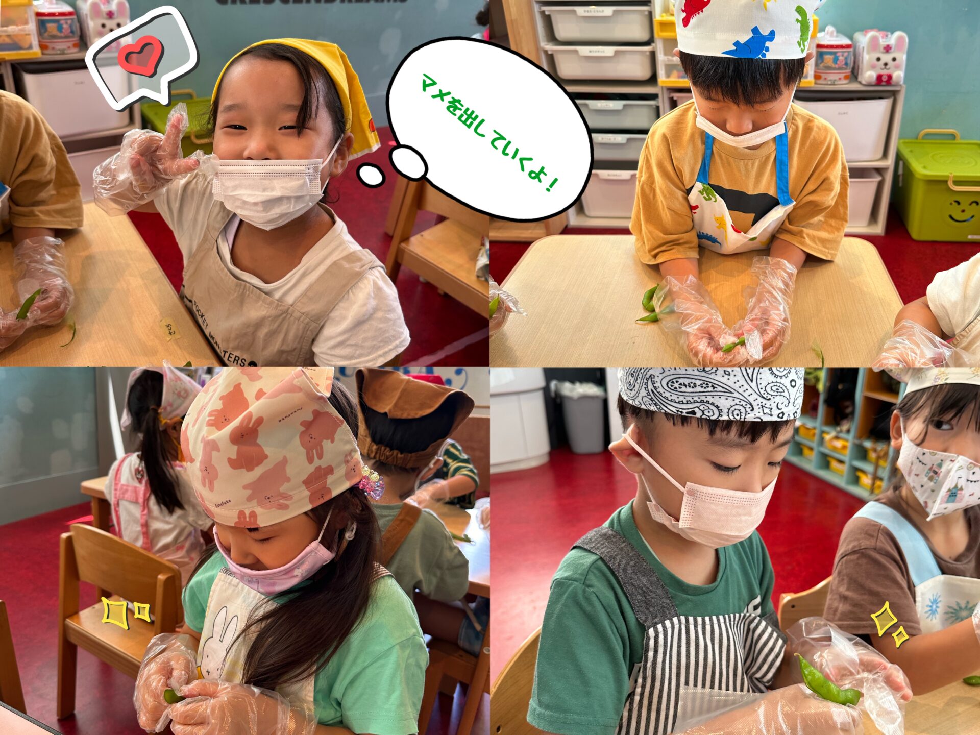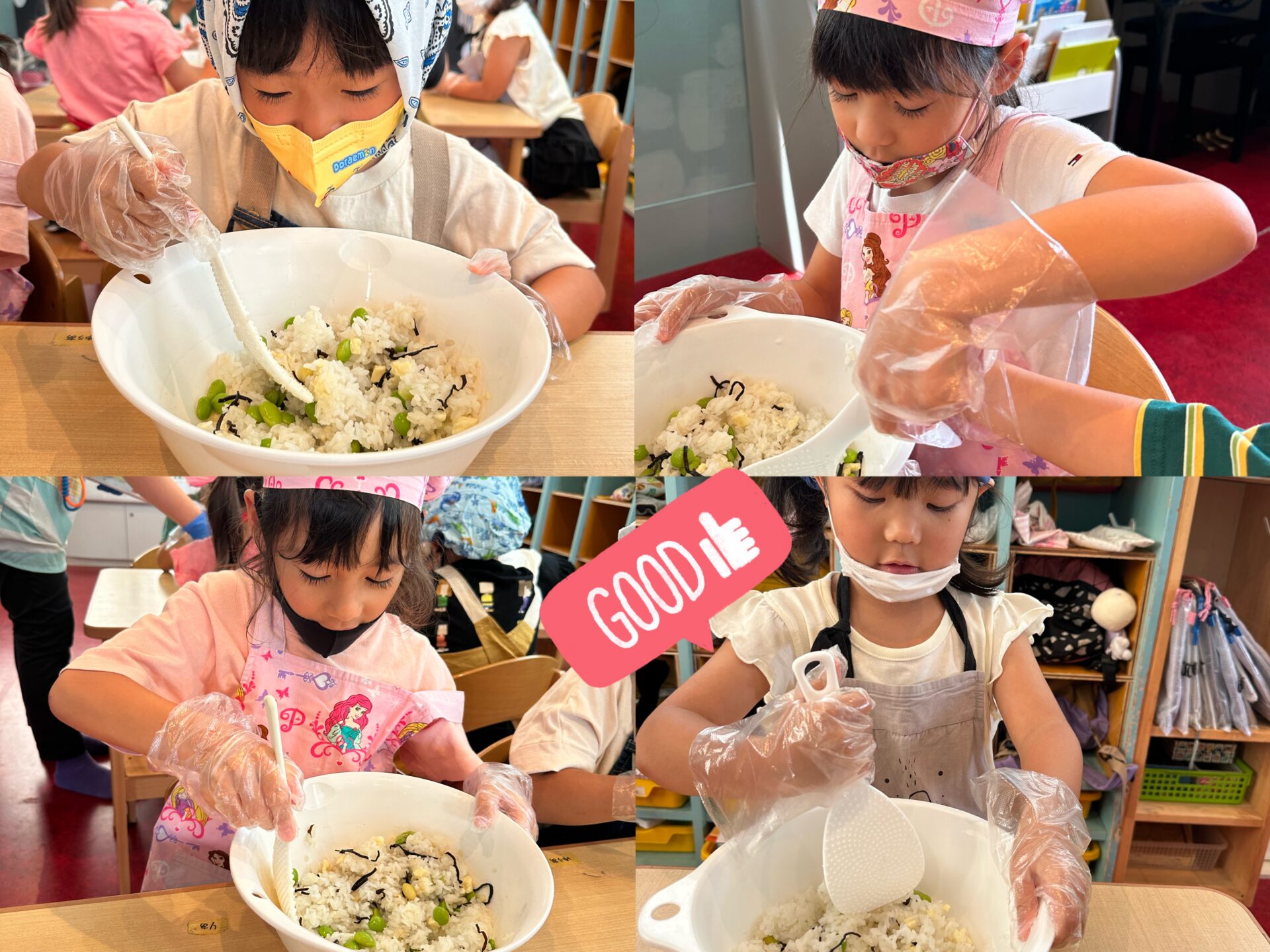 「食べるの楽しみだね♡」と話しながら収穫を行い、採れた枝豆を使ってさっそく,おにぎりクッキングを行いました🍙