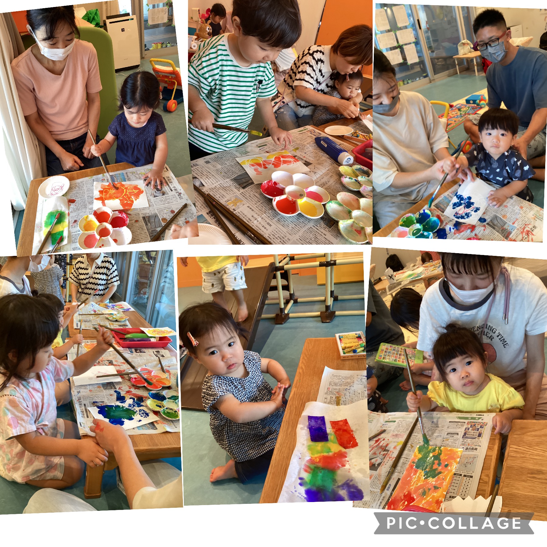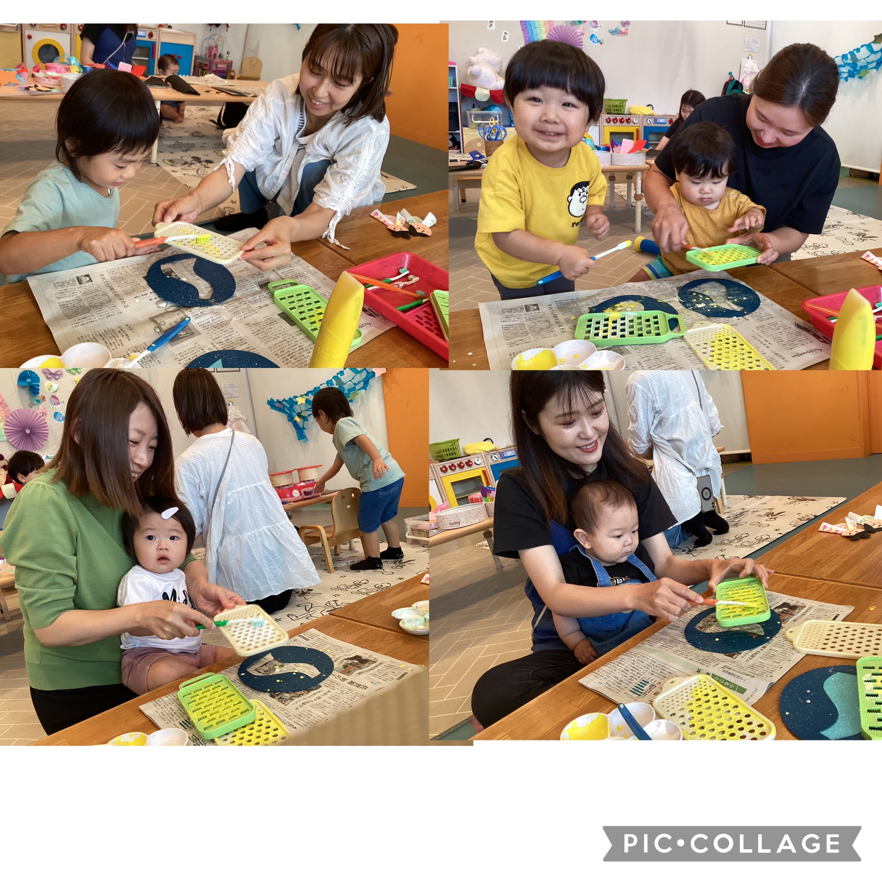 七夕製作では歯ブラシでスパッタリングをして、星空を表現。赤ちゃんたちもジーっと見て、興味深々です。