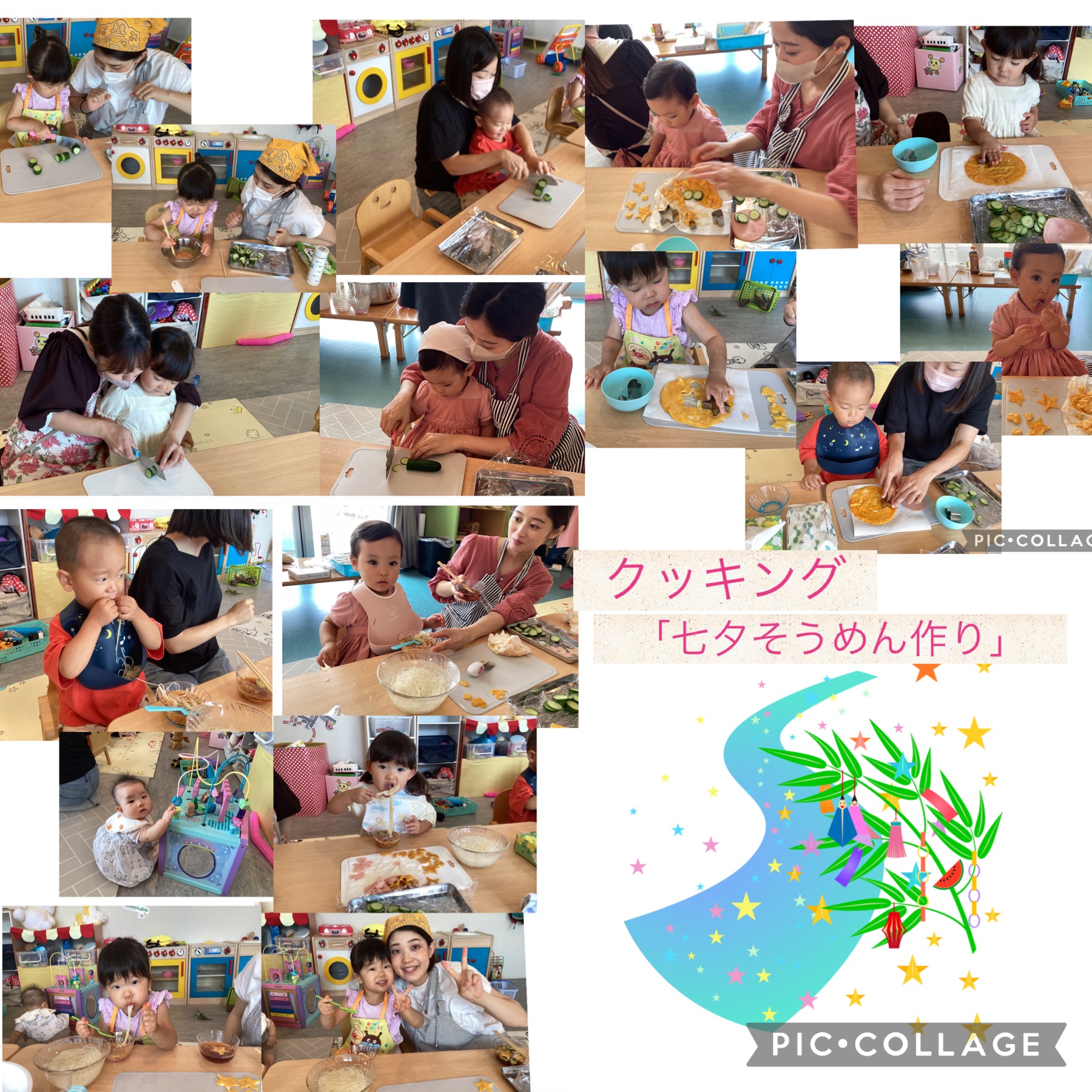 七夕にちなんでクッキングは七夕そうめんを作りました。ハムと薄焼き玉子を星やハートに型取り、トッピングをします。つまみ食いもしちゃいましょう!きゅうりもトントン♪お母さんとお料理楽しいね♪沢山おかわりをしてくれました。