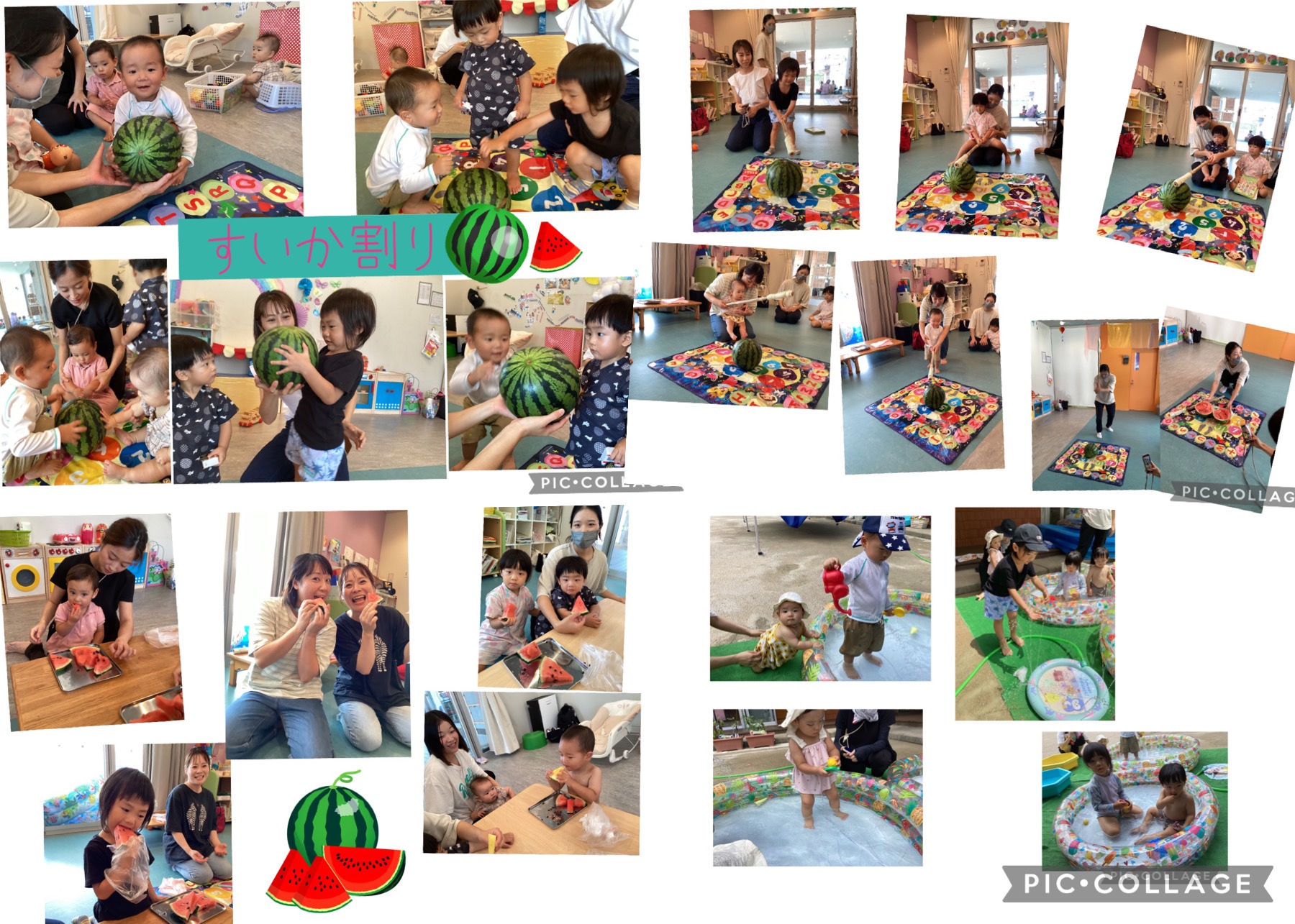 子どもたちが頑張って棒でポコン!だけどなかなか割れません。お母さんがパカーンと思い切り割ってくれました!甘いすいかを沢山食べた後は、水遊びをしました。