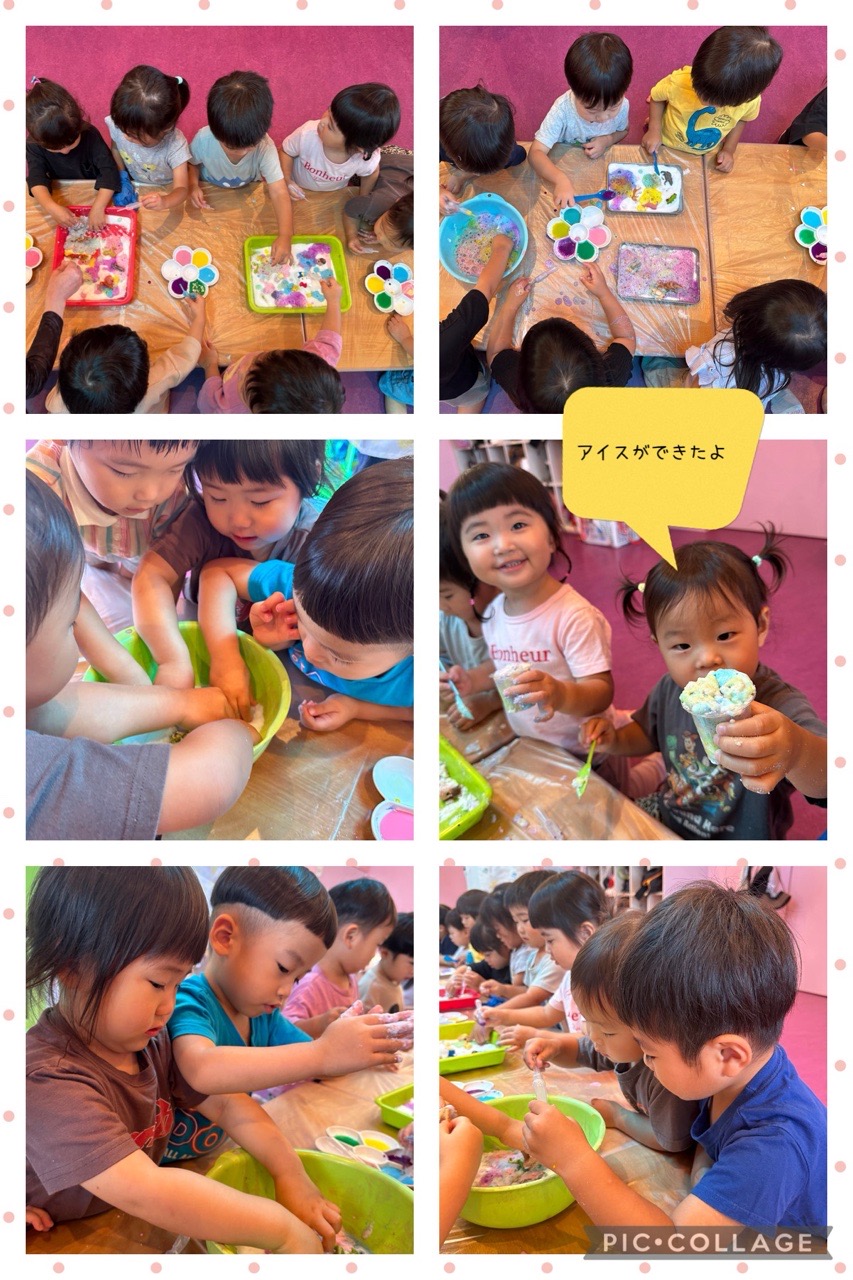 色んな色が混ざって、とっても綺麗でした😍触ってみるように促すと「つめたーい!」「気持ち良いー」とスポイトは机に置き、豪快に直接手で混ぜ始めました。子ども達が「カップ使いたい」「スプーン使いたい」と声が上がったので渡すと、アイス屋さんや、ジュース屋さんが始まりました🍨