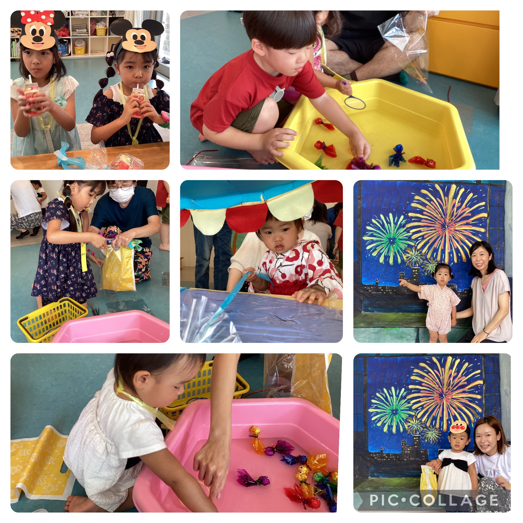 金魚すくい、的当て、お面屋さん、ひもくじを親子で回り、お菓子やジュースで乾杯🩵💛夏の思い出になったかな?
