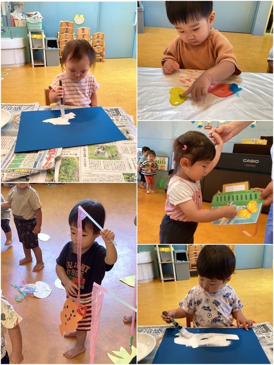 手先もどんどん器用になり、シール貼りや両面テープ剥がし、糊付け、虫取り遊び、筆、魚釣りゲーム、スライムの感触など、真剣な表情で行う姿が見られました👀✨
