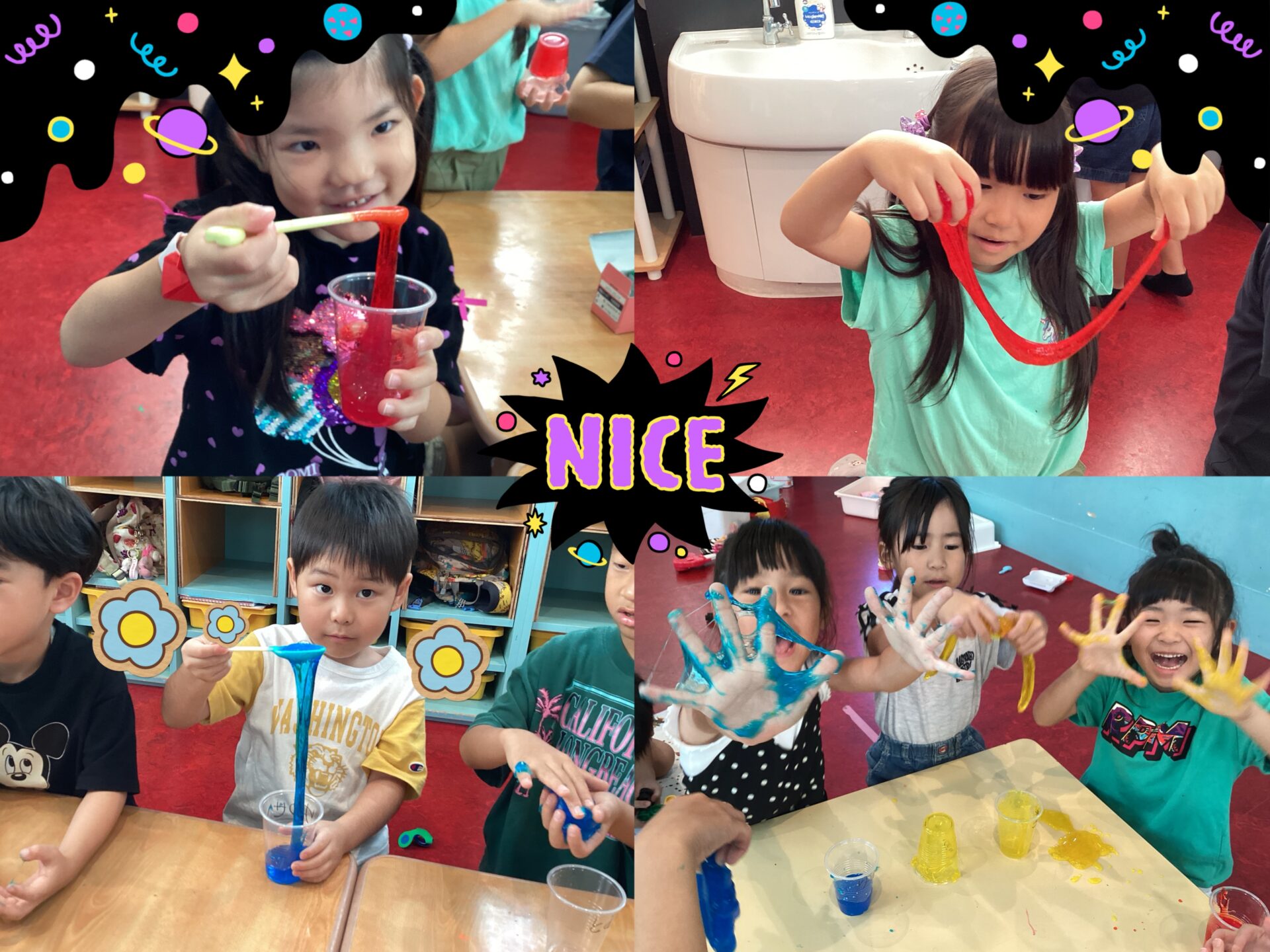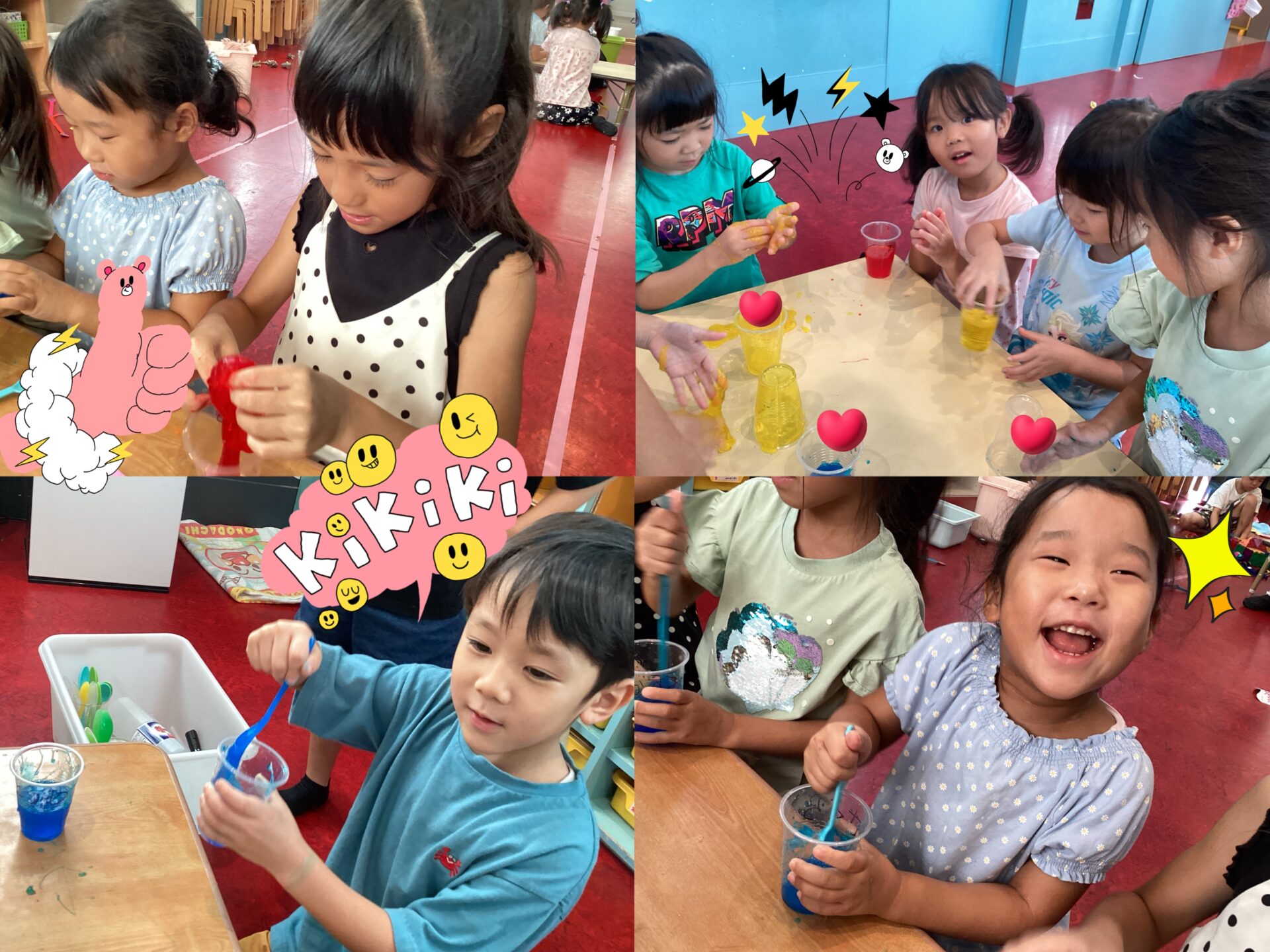 スライムをした時には、手を使わずにスプーン等で伸びるのを楽しんだり、感触を思い切り喜びベタベタくっつけながら楽しそうな子ども達!。💫