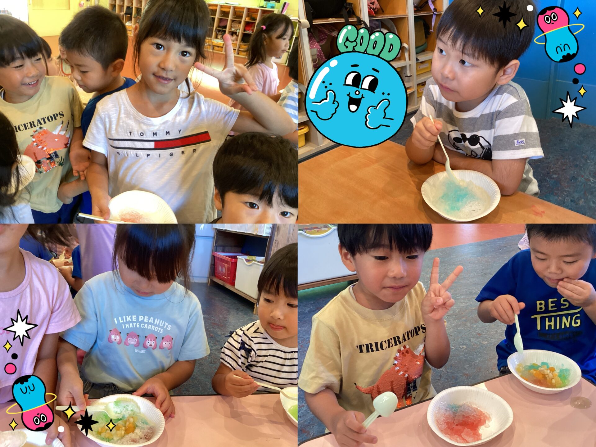 かき氷会🍧にも参加し、フルーツや自分達の好きなシロップを好きな量をかけて食べ、😍