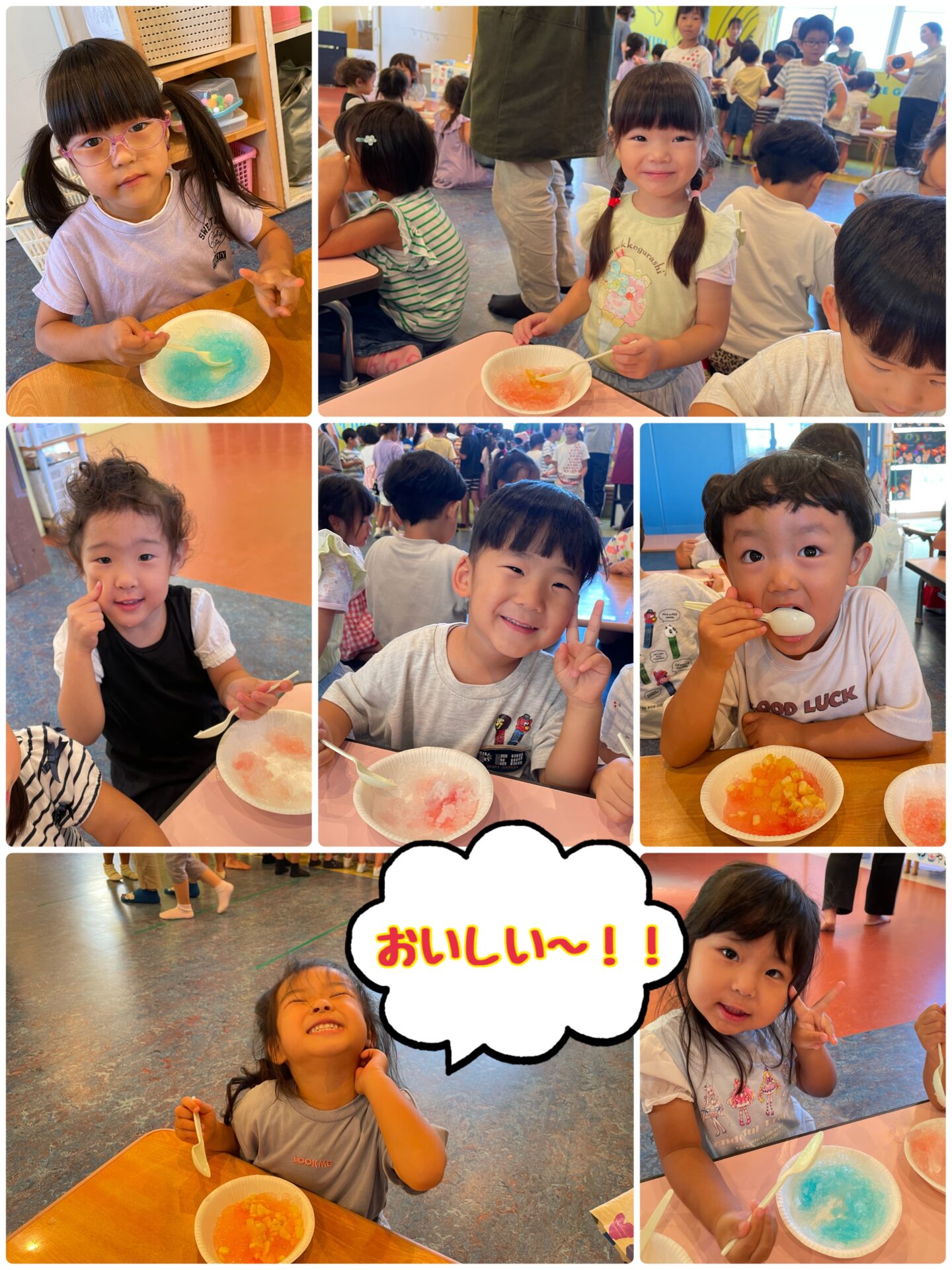 かき氷会では、いちご、メロン、ハワイアンブルーの3種類から選,びフルーツのトッピングもして美味しそうに食べていました🍧