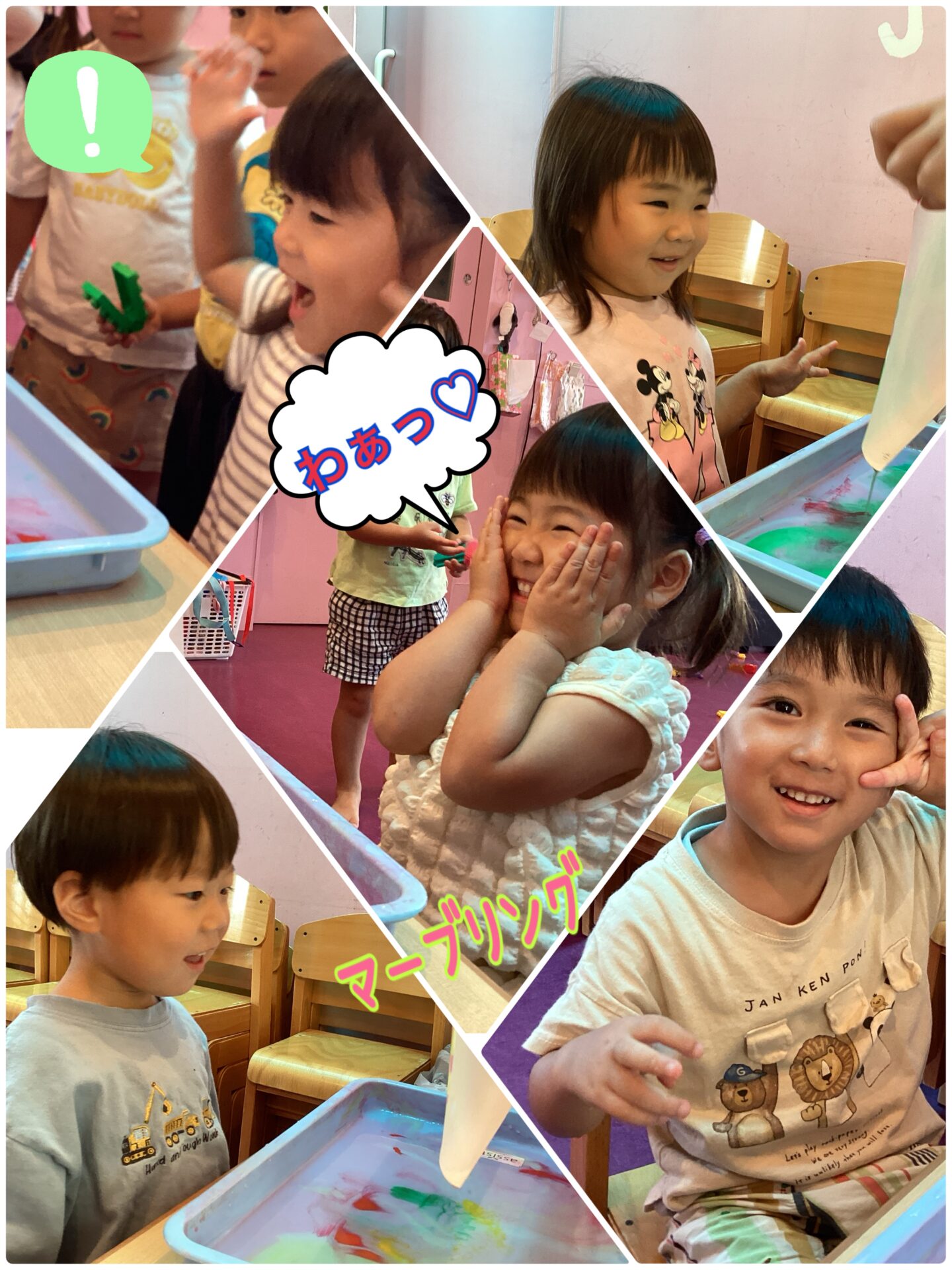 今回もマーブル模様になった紙を見て、『わぁ!きれい〜!』など、とても良い反応を見せてくれました♡