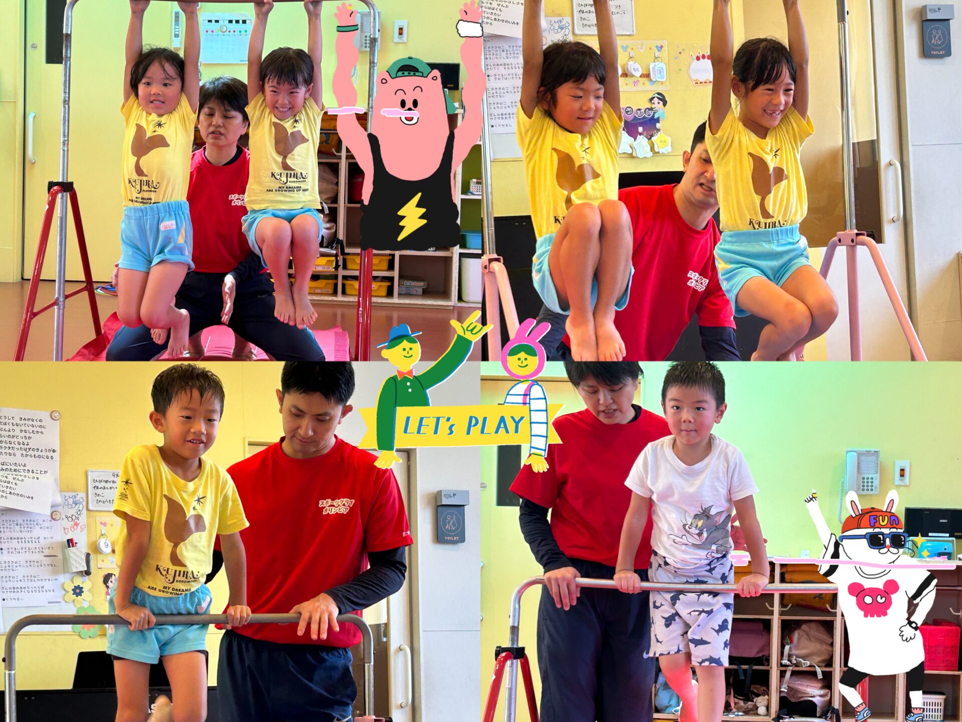 鉄棒にぶら下がったり、足かけまわり・前まわりなどに挑戦して取り組みました💪✨「お腹がいたーい」と言いながらも楽しく参加していました!