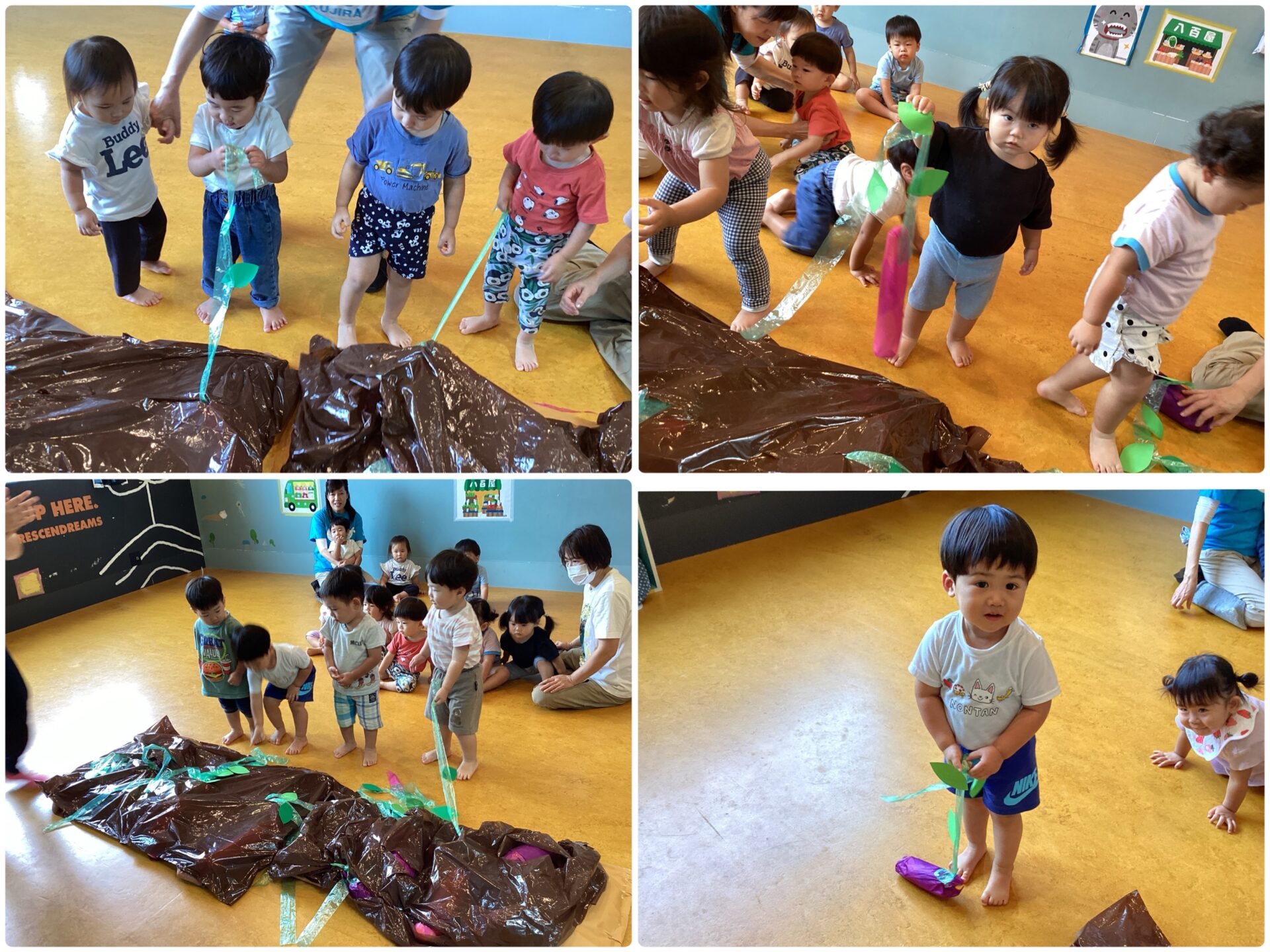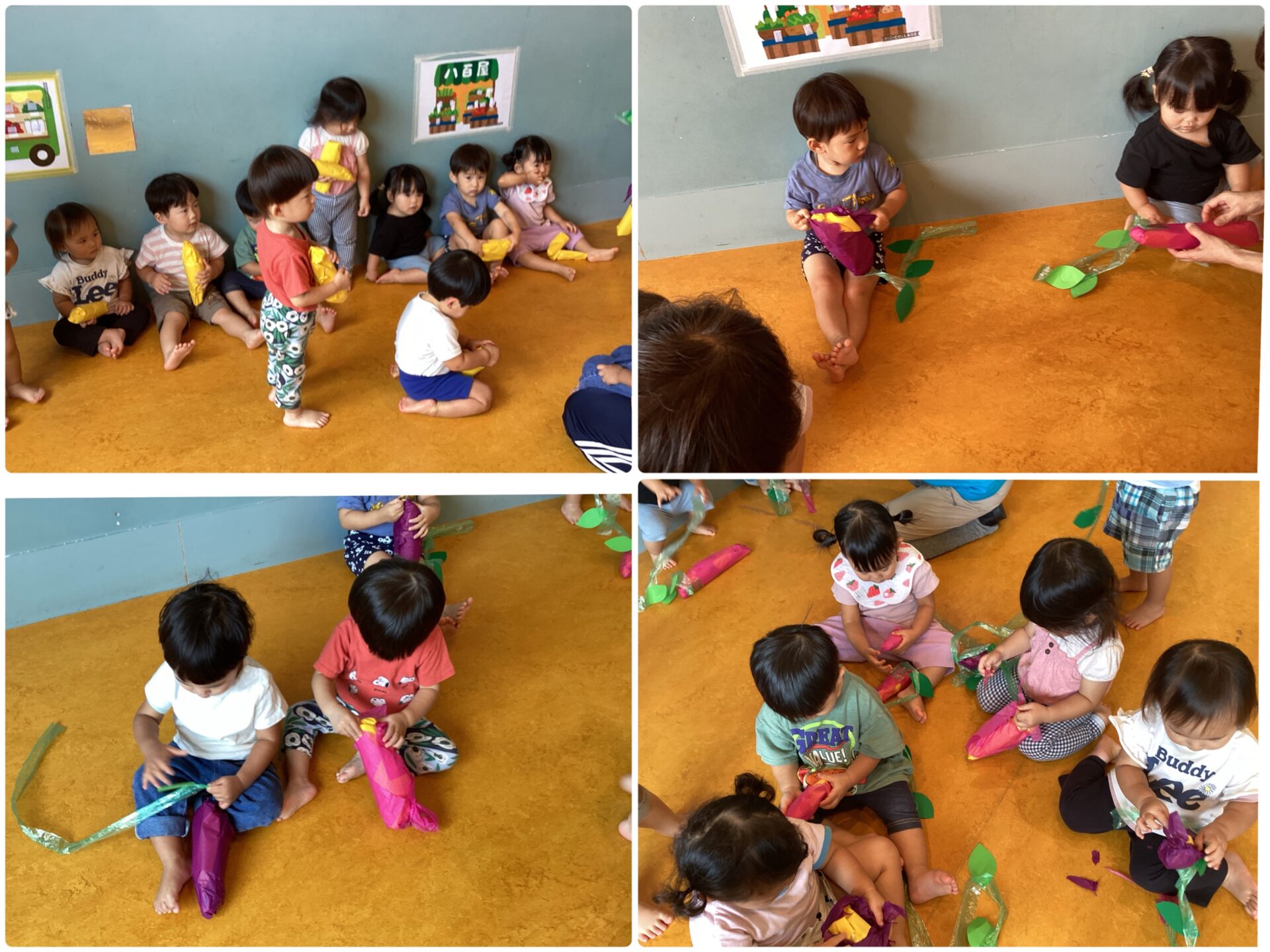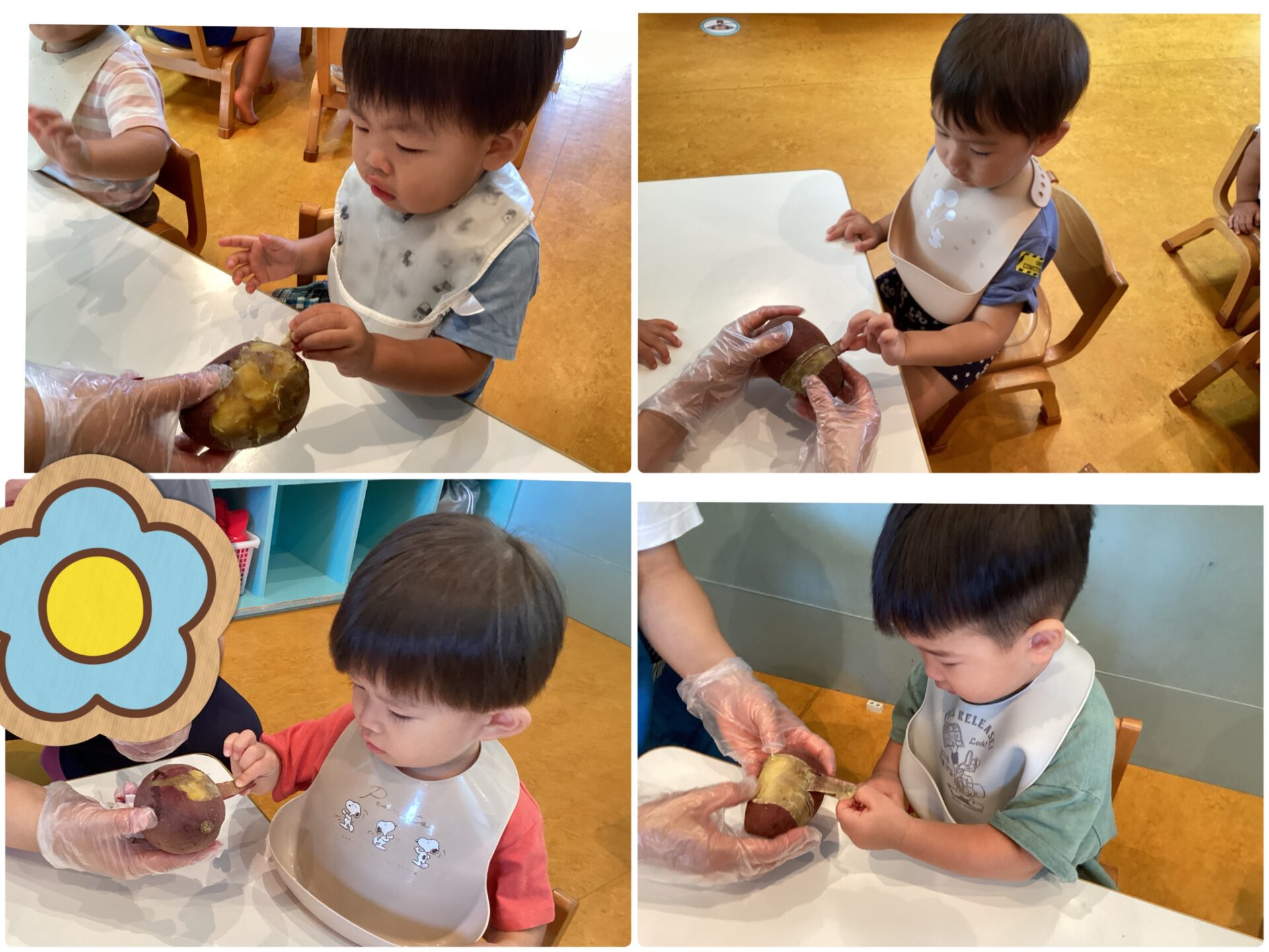 まずは芋掘りごっこ遊び!!うんとこしょ、どっこいしょ!と掛け声をかけながら芋づるを引っ張り、皮剥きまで頑張りました🎵
