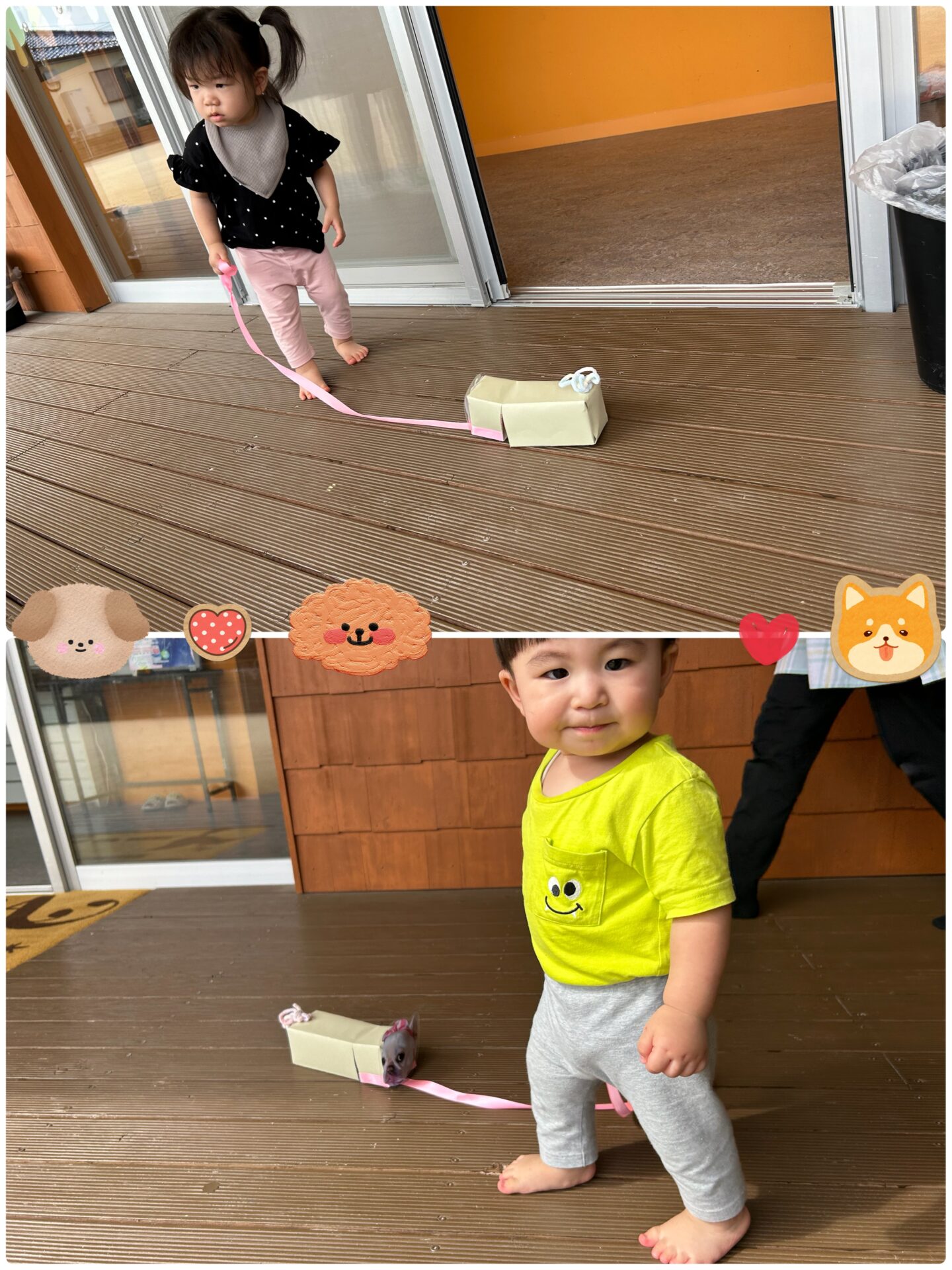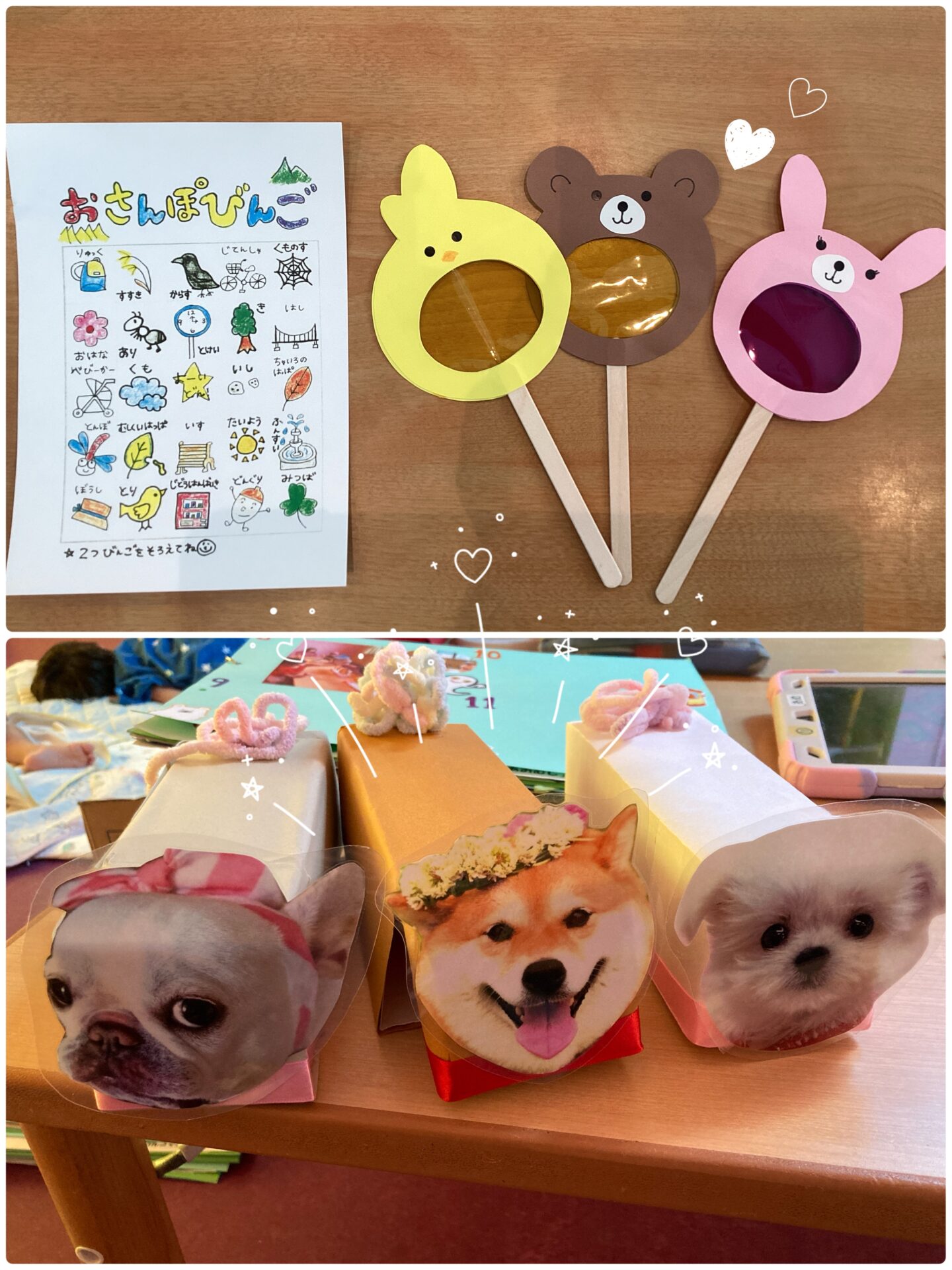 何を作ろうか保育者で話し合い、自由時間に遊べるものにしようということで、「お散歩ビンゴ」「お散歩メガネ」「お散歩わんこ」「牛乳ぽっくり」「紙飛行機コーナー」に決まりました👏