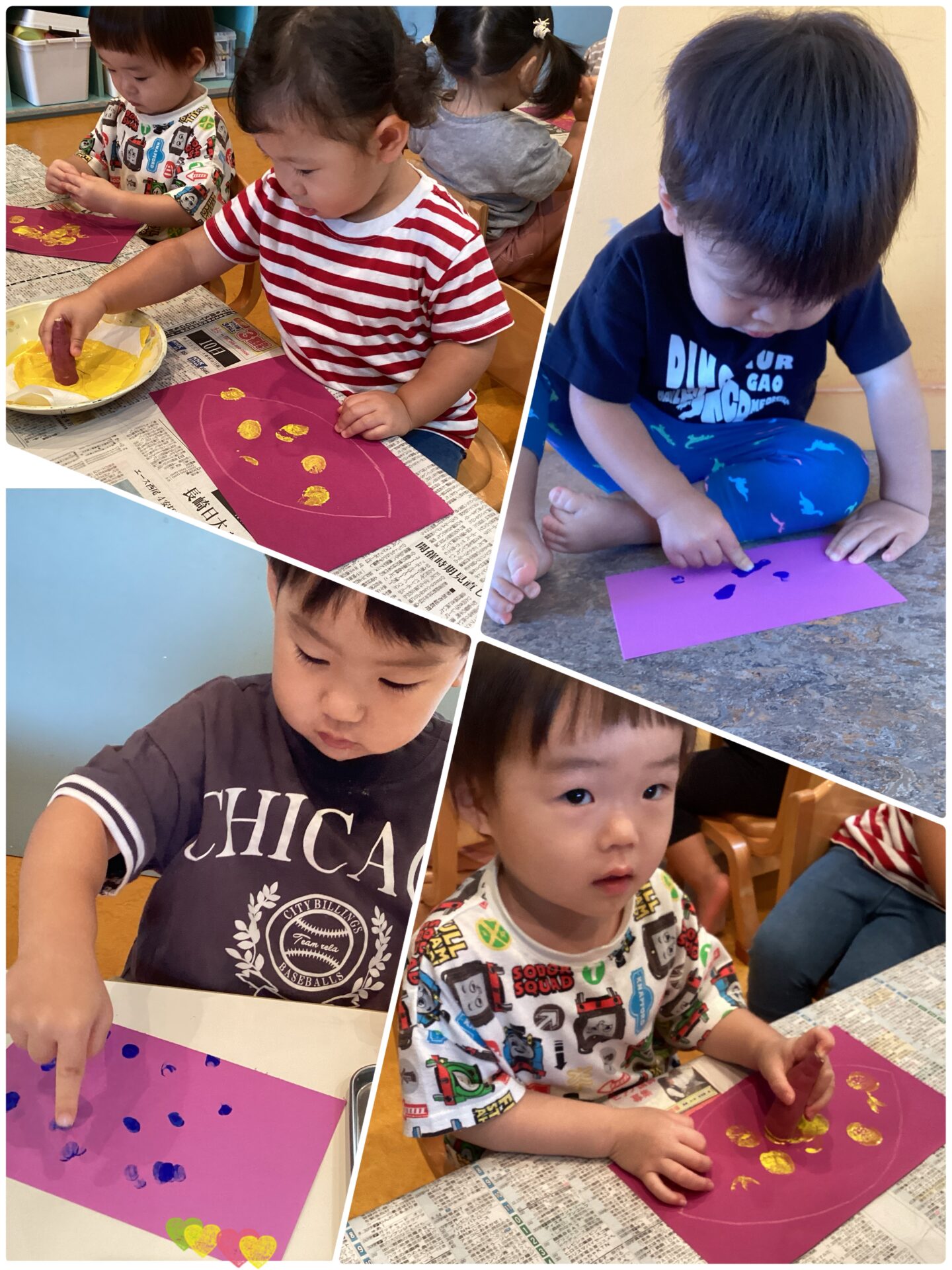 子どもが握れるサイズのお芋を渡すと、握りやすかったようで、自分たちで絵の具をつけて、丁寧にぎゅーと押し付ける子もいれば、トントンたくさん打ちつけるような、子どもとそれぞれの姿が見えました。😄