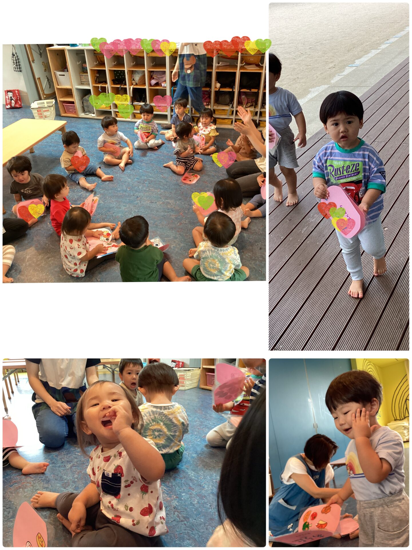 戸惑う子どももいましたが、数日続けると新鮮な気持ちで、みんなで並んでお集まりを楽しんでます。 お気に入りの『バスごっこ』の歌中の1枚です。
