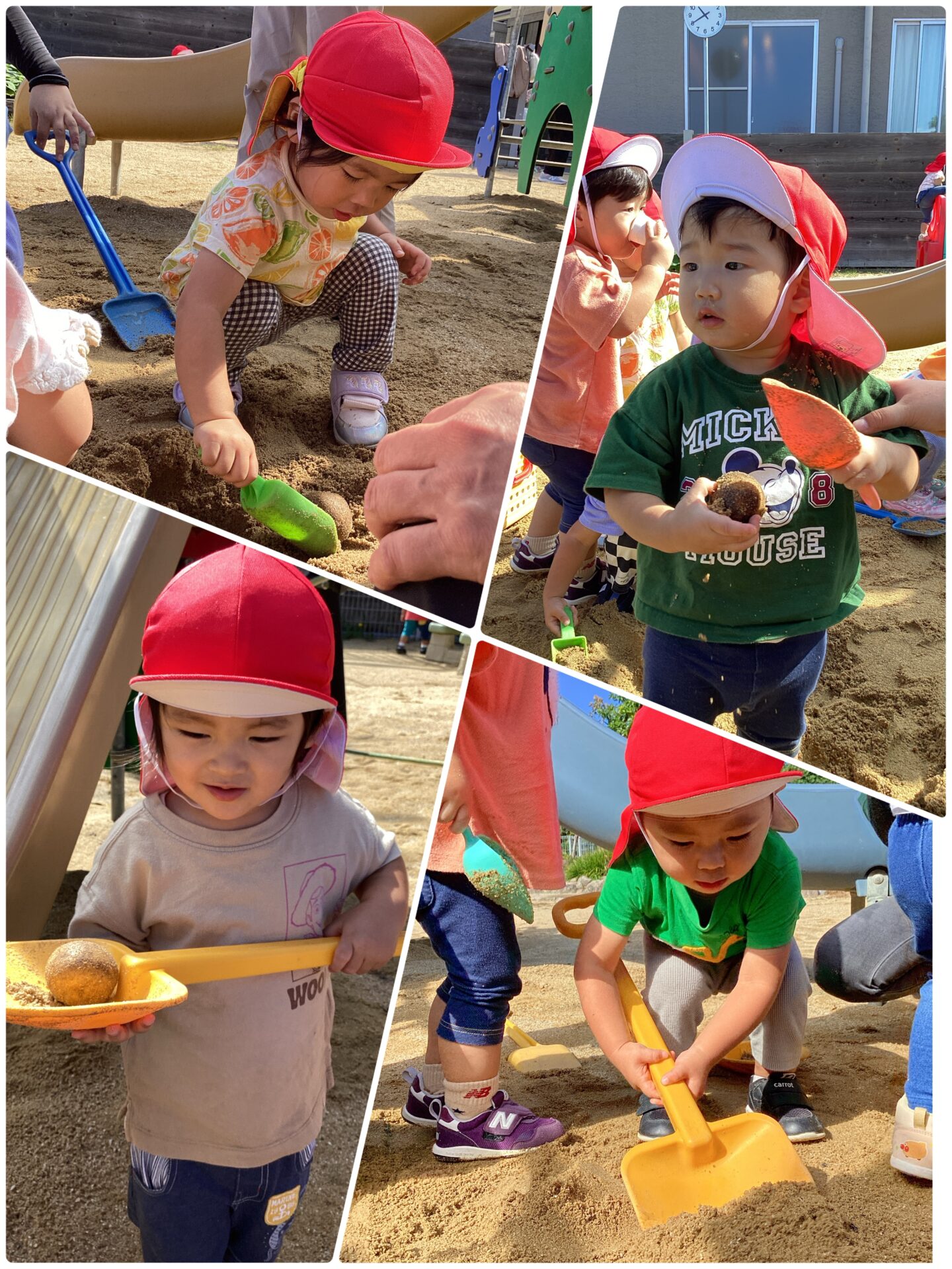 砂場に本物のじゃがいもを隠して見つける遊び、何回も掘って見つけるのを楽しんでいました。