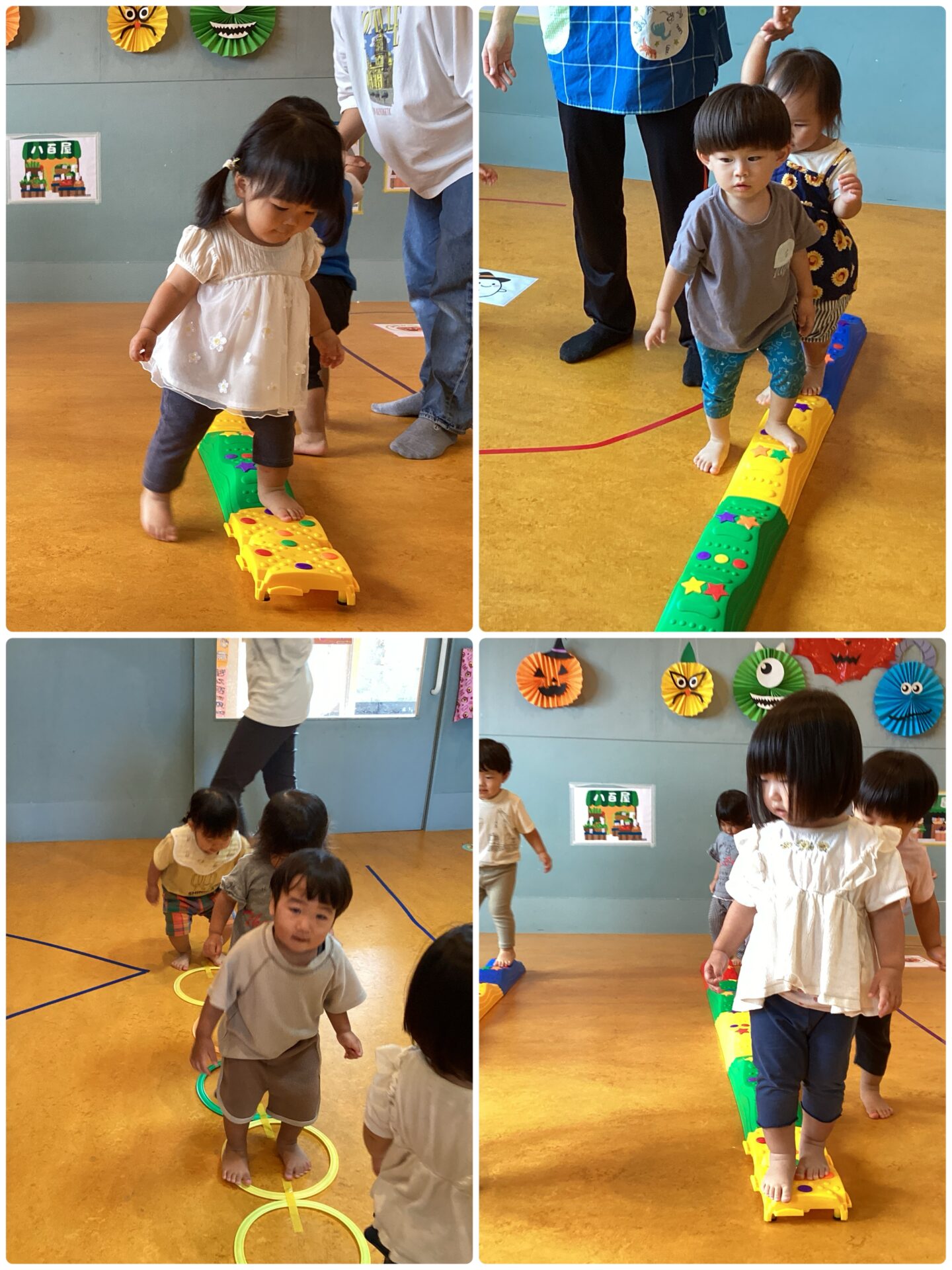 運動遊びも楽しみました!平均台の上に頑張って足をのせようとしたり、上手に渡れるようになっている子ども達も出てきました。