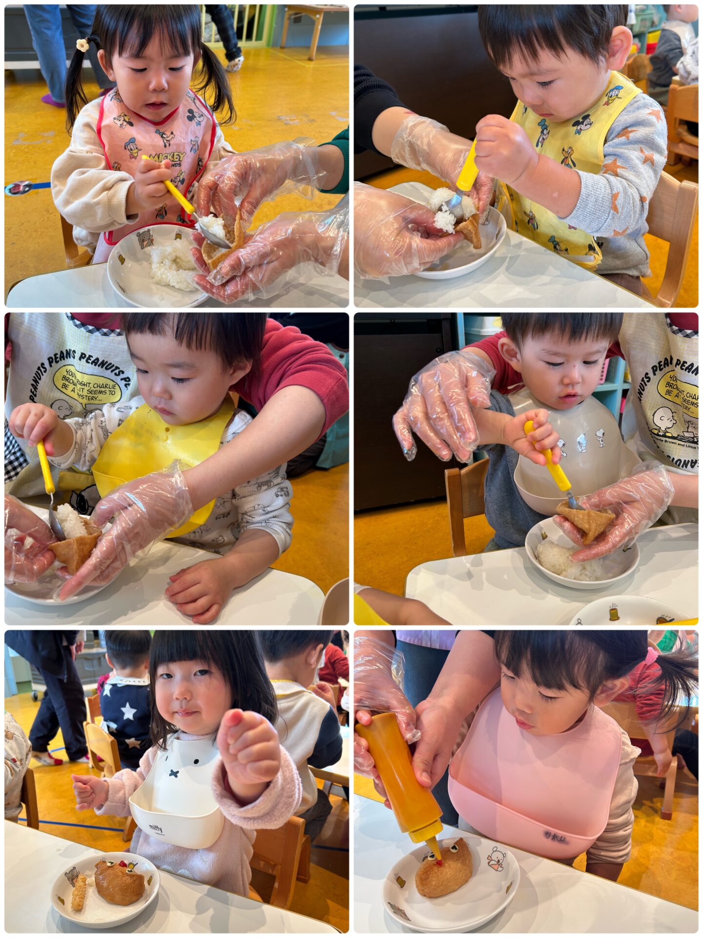 稲荷の皮にご飯を詰めることや、目やツノを自分たちでつけて楽しんで作りました。