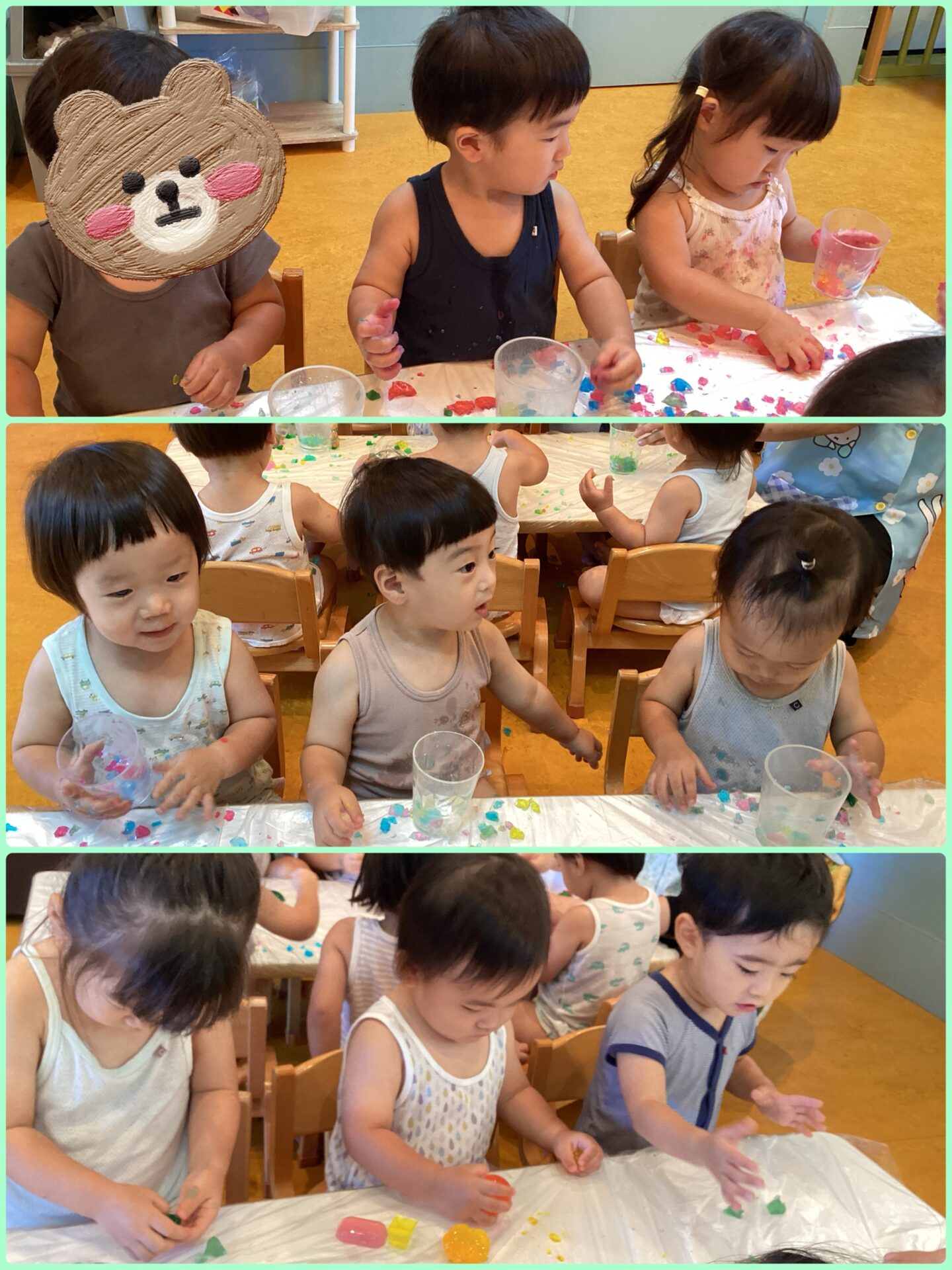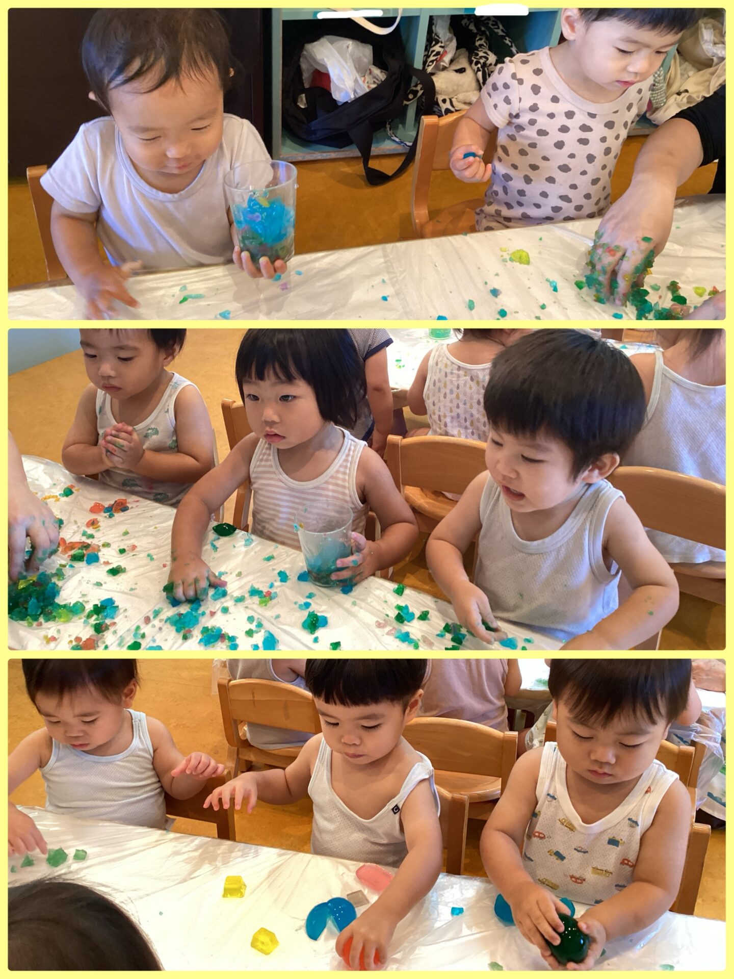保育者が潰したり触ったりを見せると、次々と真似して楽しみ出しました✨
