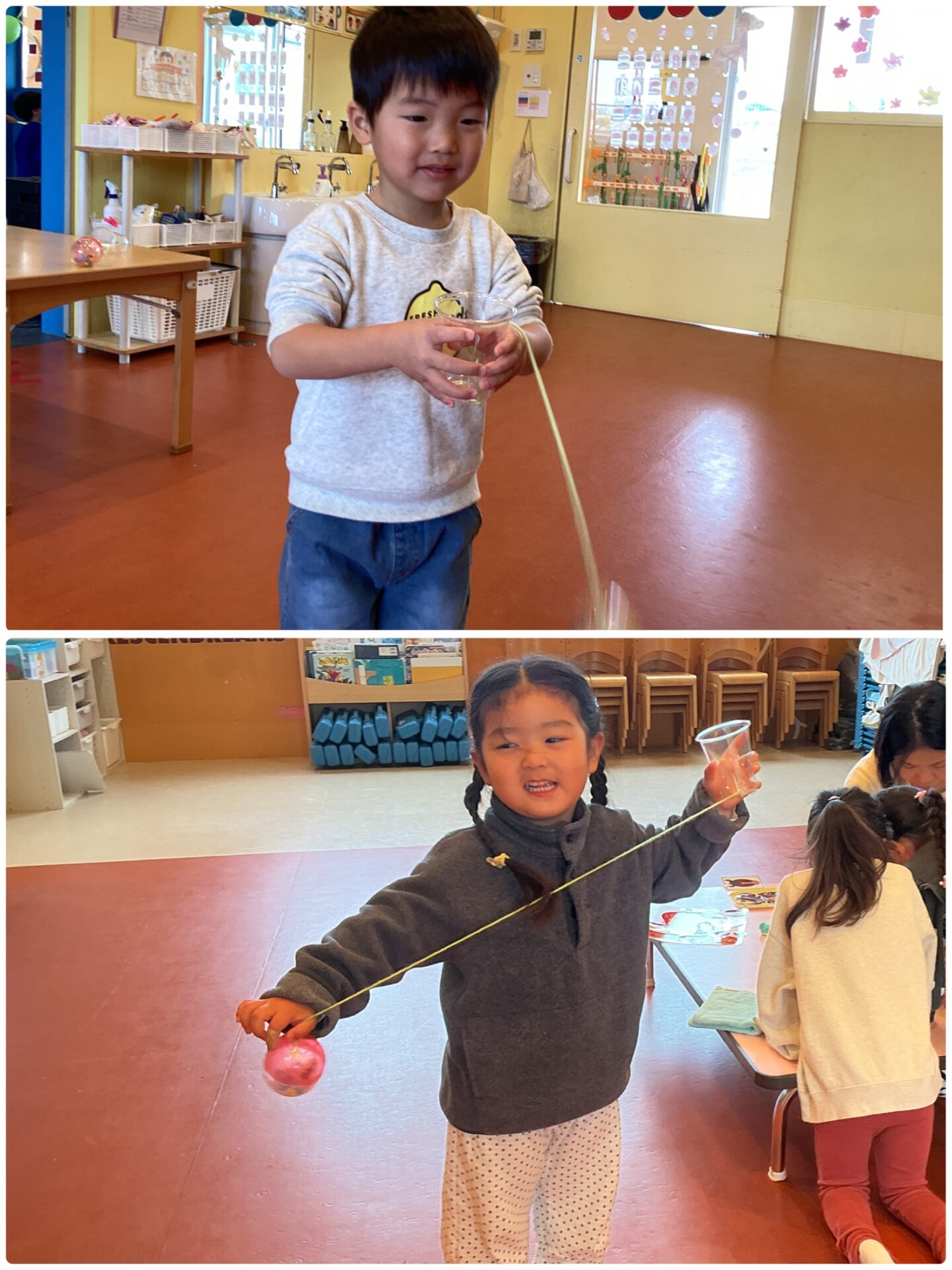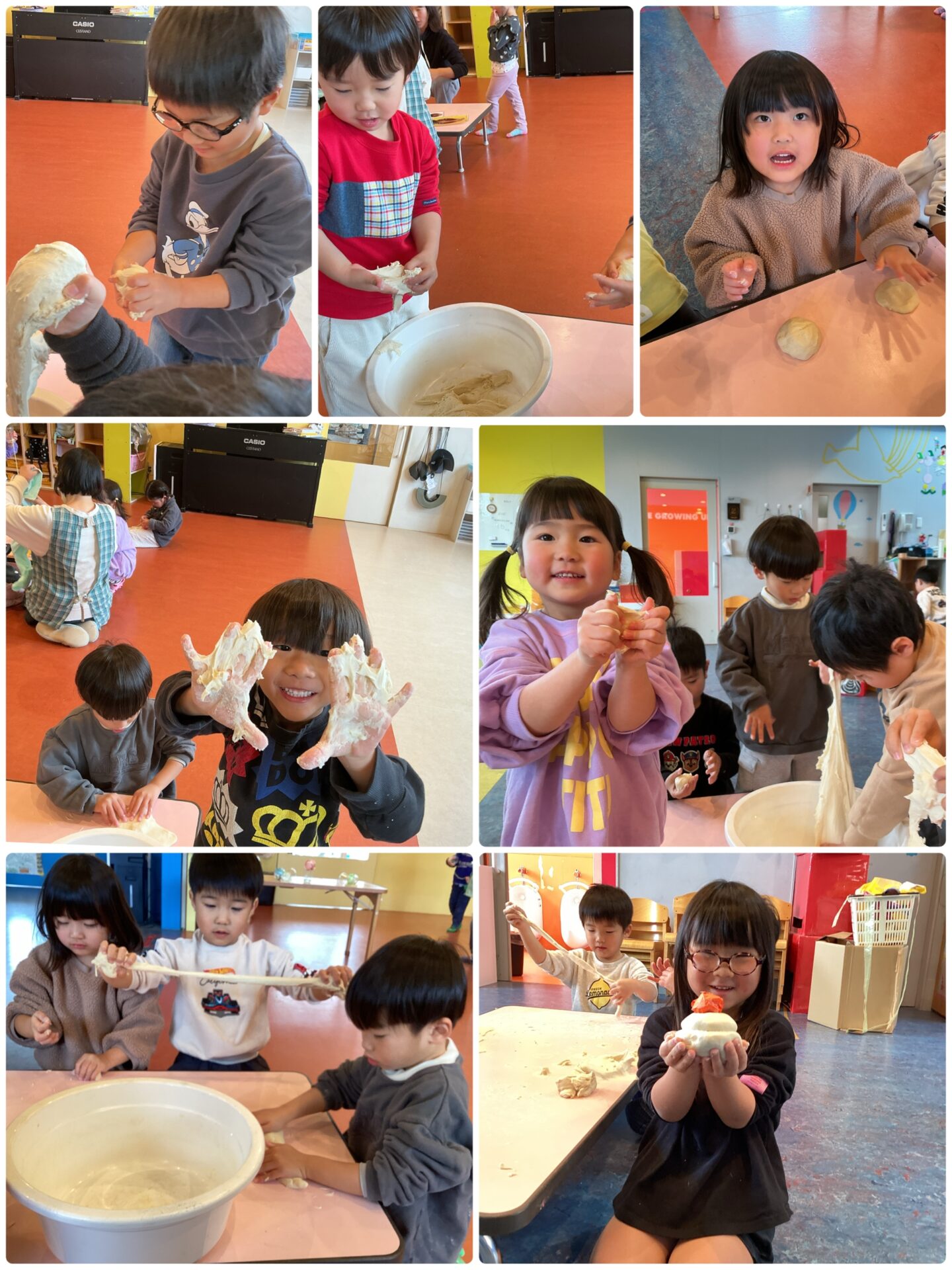 ついた餅で、こねこね丸めてみたりのばしてみたりして、感触を楽しんだものの…餅のように手についてきて、取るのに苦戦していました😅💦