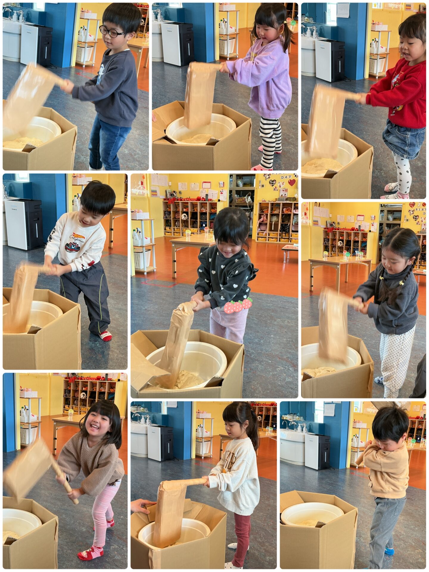 別の日には、お正月遊びをしました。まずは、小麦粉粘土で見立てた餅で、餅つきをしました💪✨