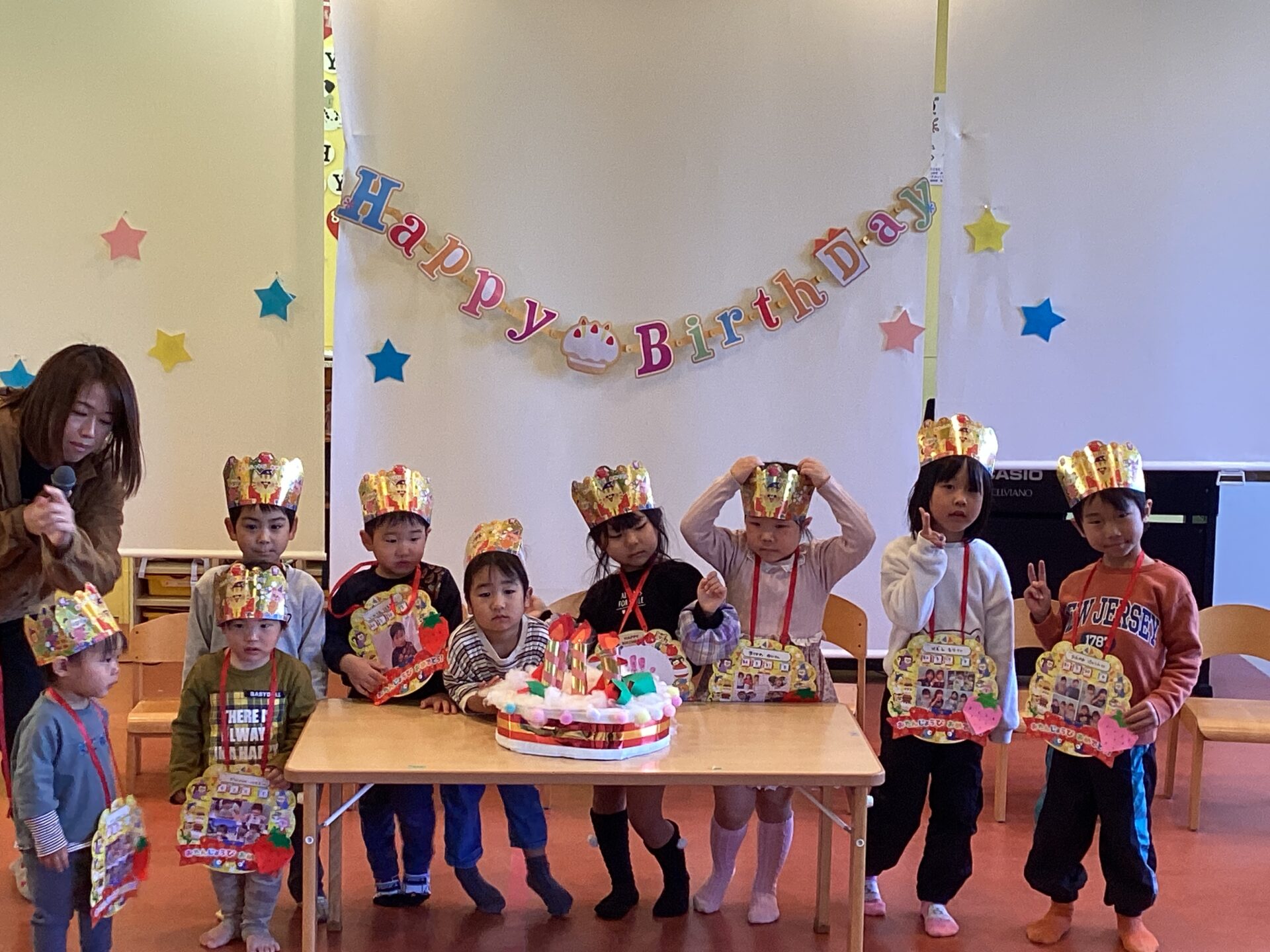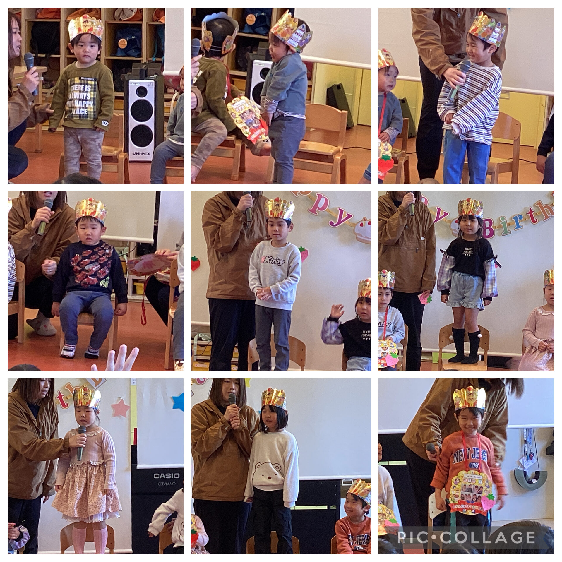 今月のお誕生者は9名のお友達でした。恥ずかしがりながらも名前や質問にしっかり答える事ができました♡いちごの可愛らしい名札でしたね🍓