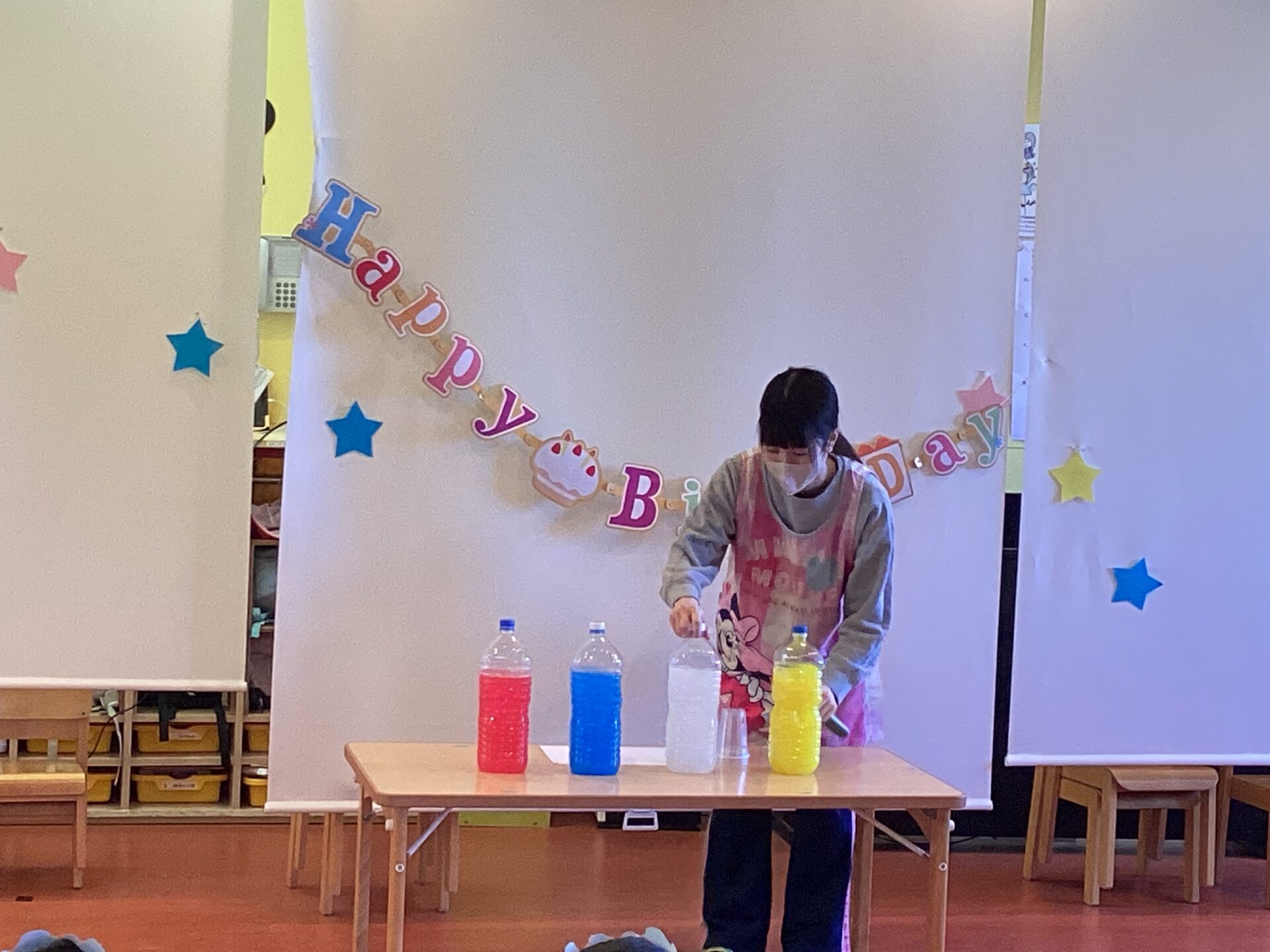 先生たちの出し物は色水遊びとサザエさんダンス💃混ぜたら混ぜたら何色になるかな???