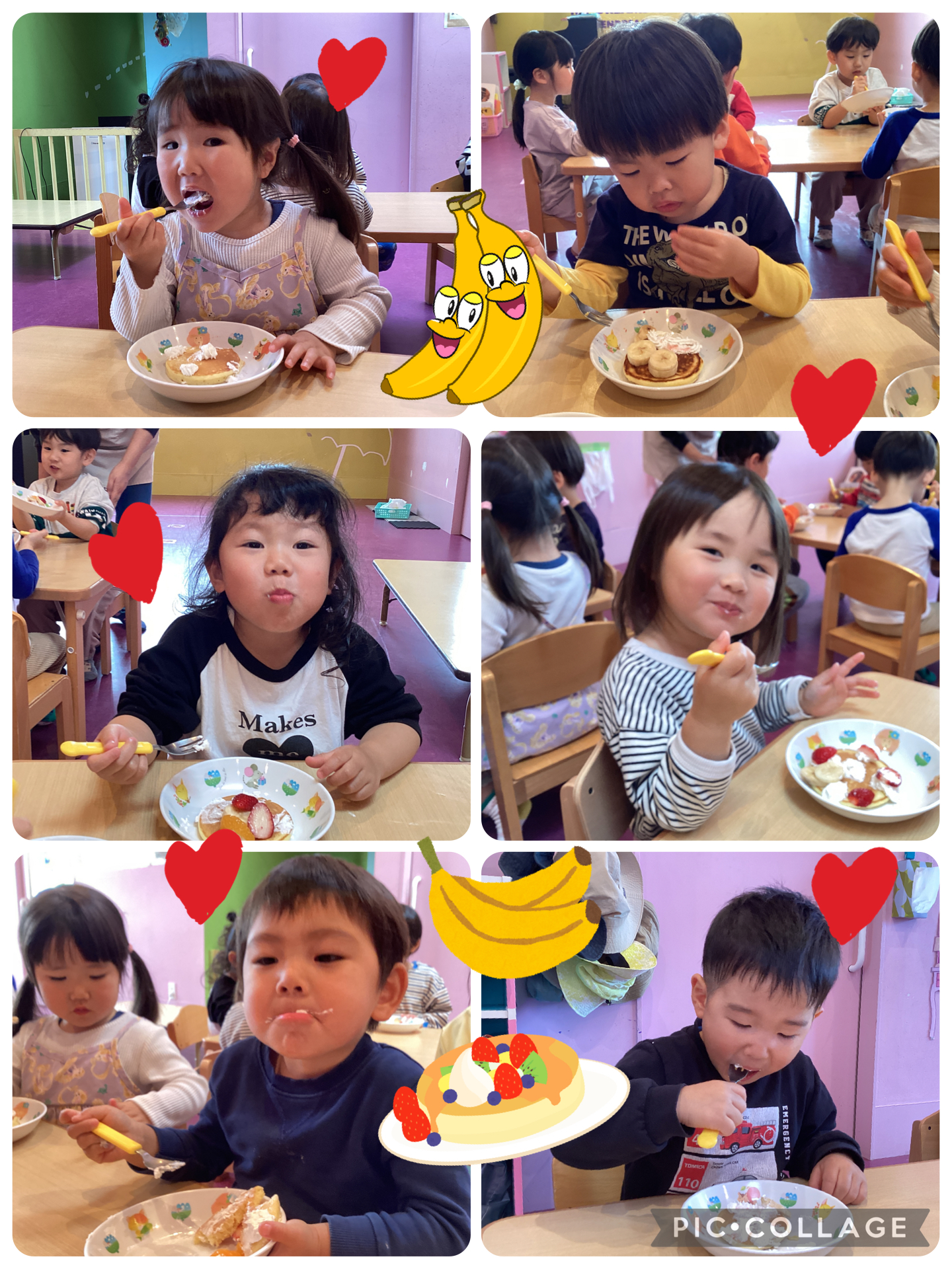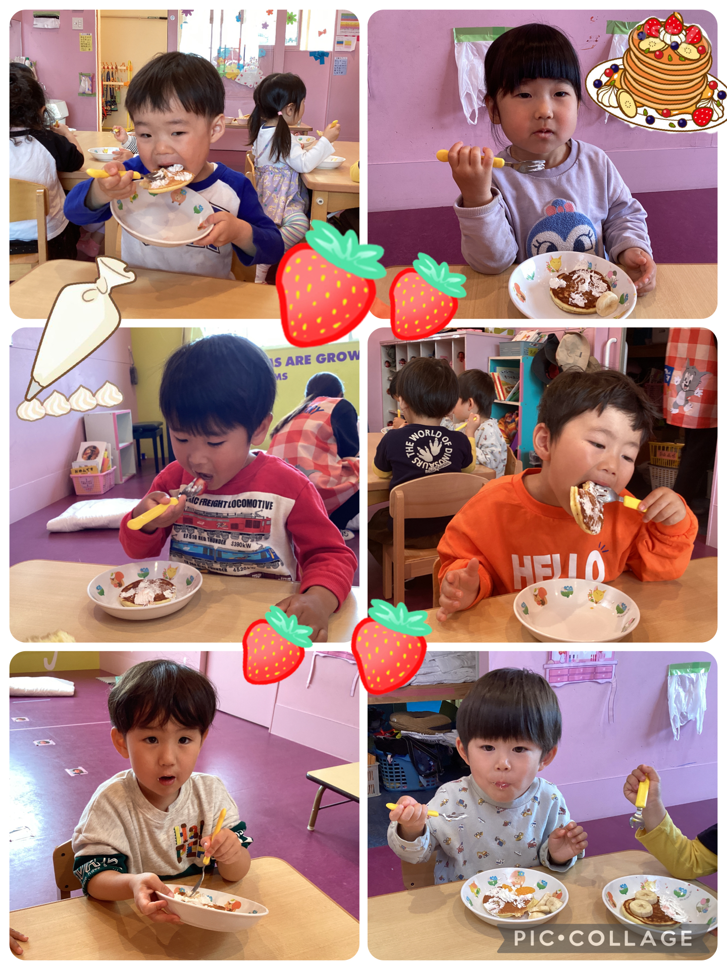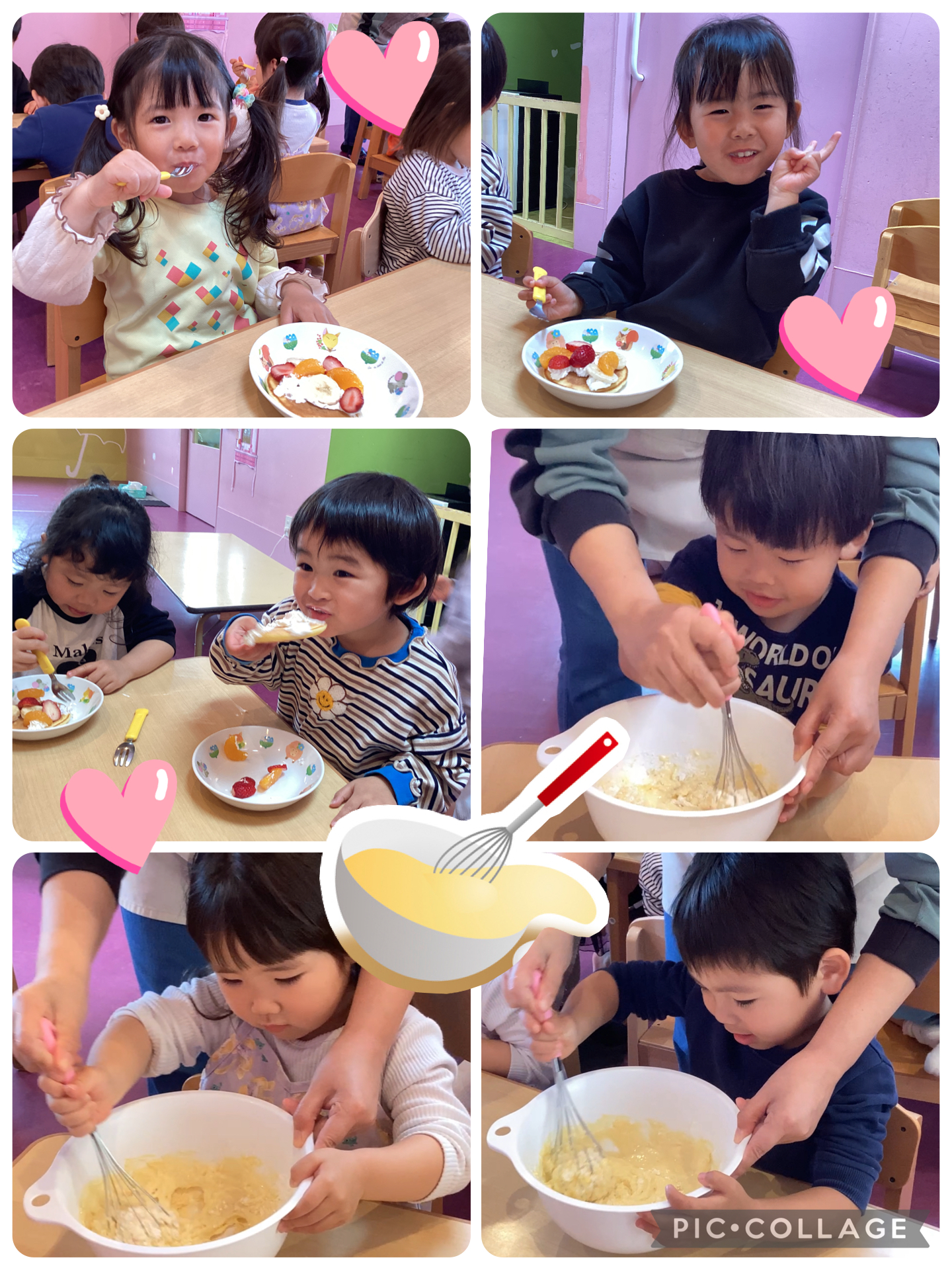 あめチームの最後のクッキングではみんなが楽しみにしていたホットケーキ作りをし、上に生クリームやいちごやみかんバナナをのせました🩷とっても美味しそうに食べていましたよ😊