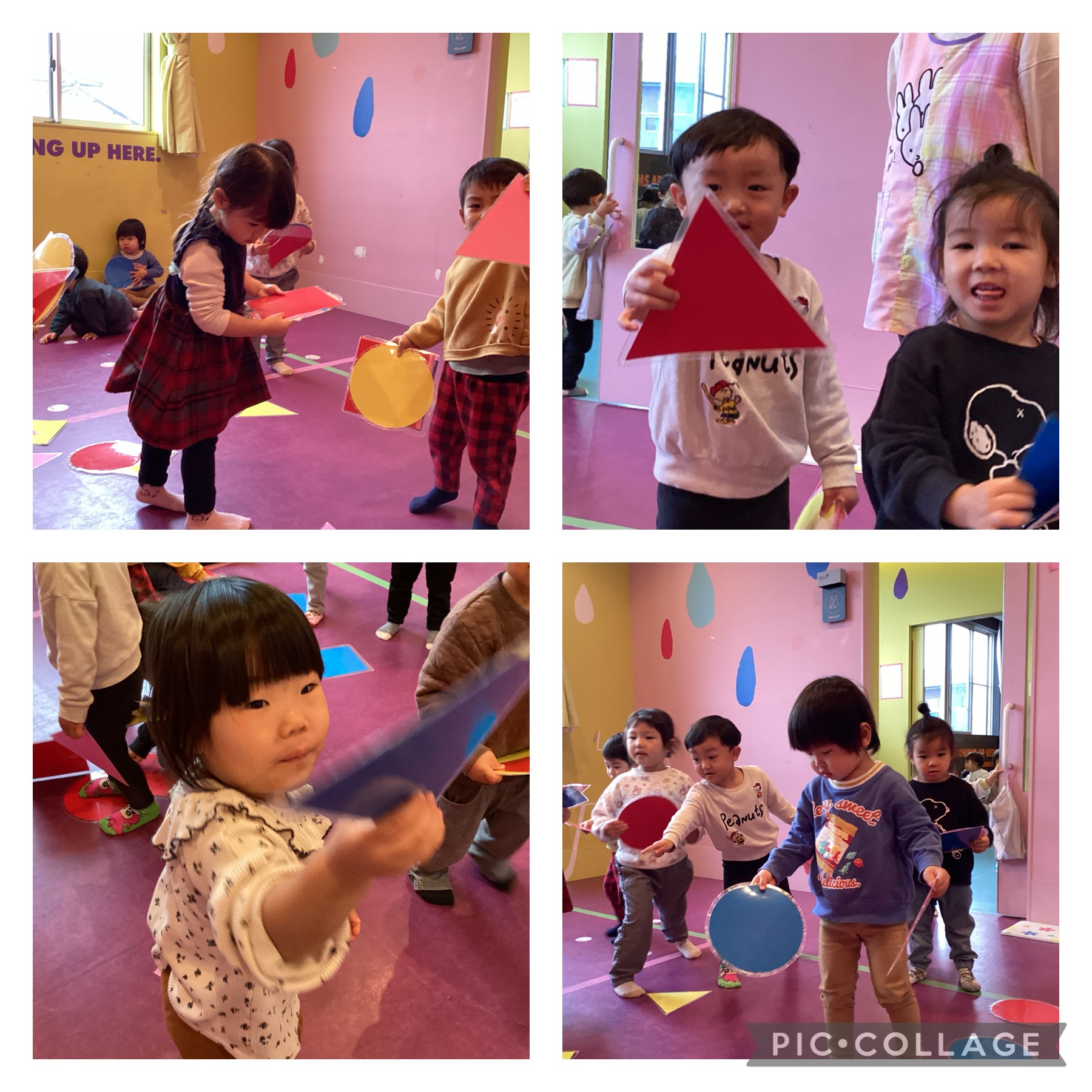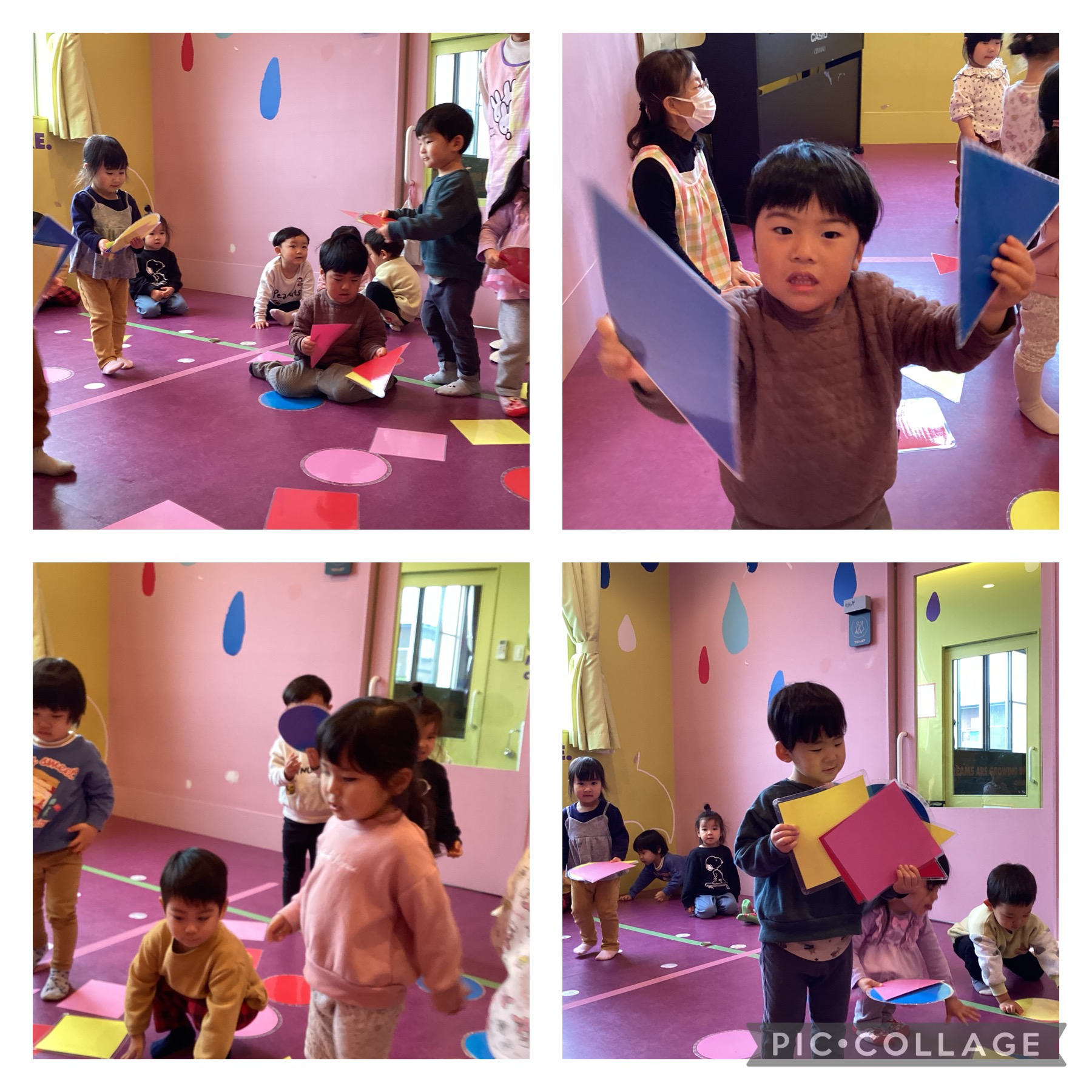 色々な色や形のカードを用意し、「青の三角!」等色や形を探すゲームを行いました😄