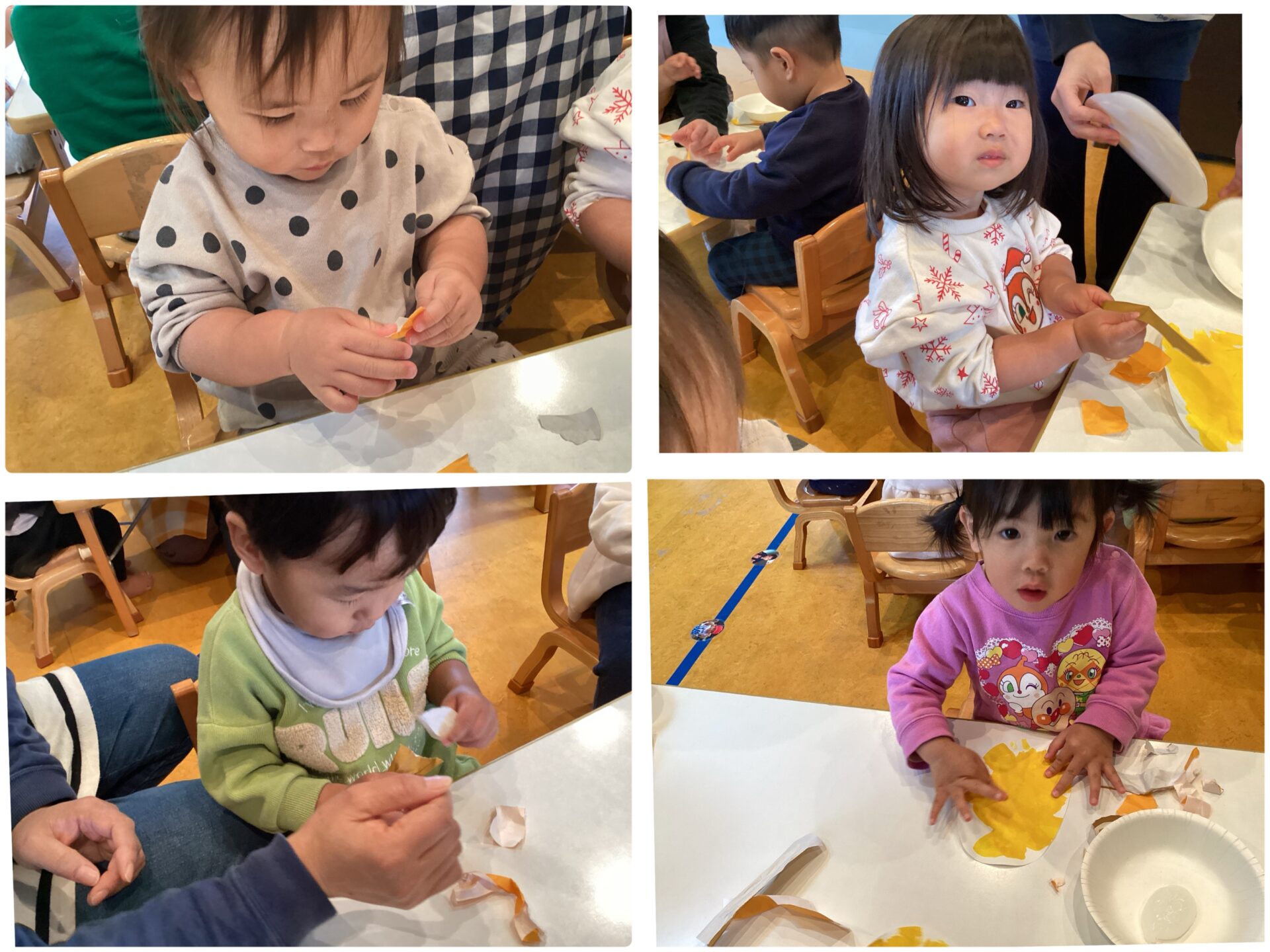 今月はお散歩に行ったり、製作ではのり付けを自分たちでしました♪