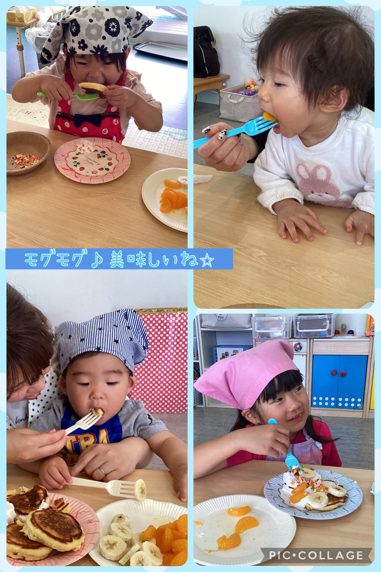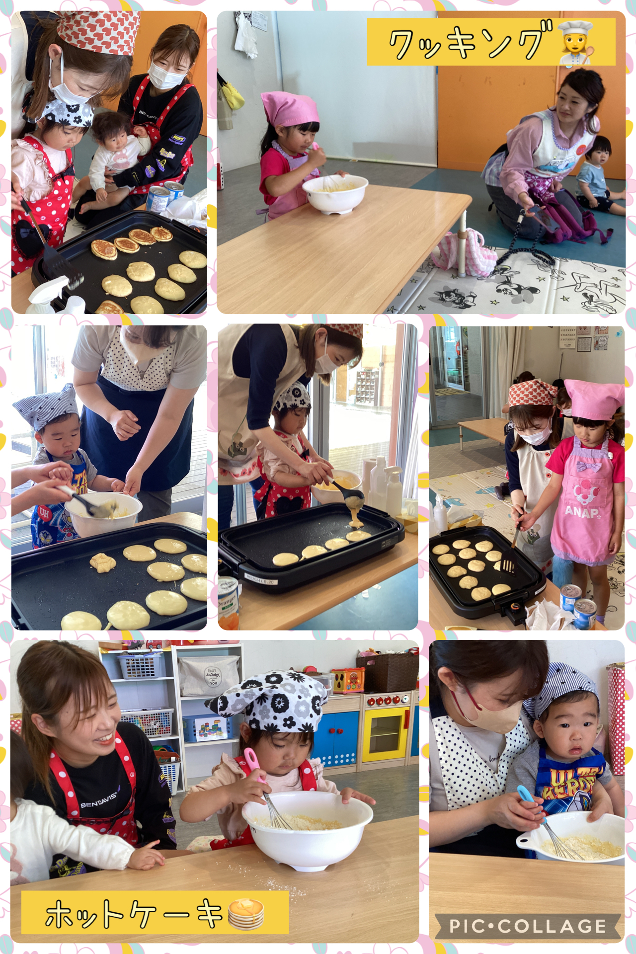 粉を混ぜたり、ホットプレートに生地を流したりと、お母さんや先生と一緒に楽しいクッキングを行いました♡👩🍳