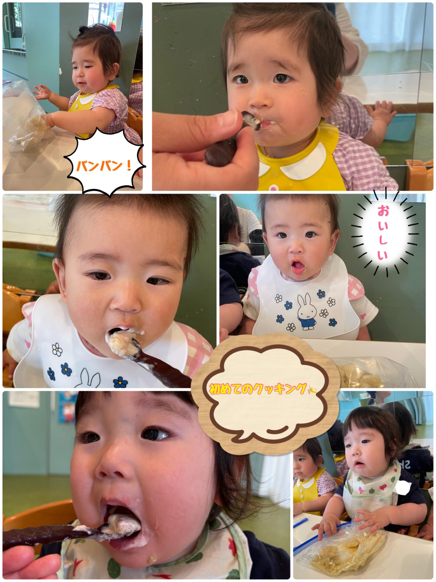 潰したバナナとベビーダノン(いちご)を混ぜて食べると大きなお口をあけて